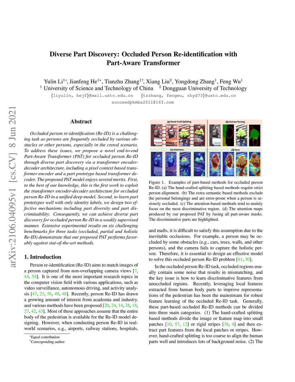 Occluded person re-identification (Re-ID) is a challenging task as persons are frequently occluded by various obstacles or other persons, especially in the crowd scenario. To address these issues, we propose a novel end-to-end Part-Aware Transformer (PAT) for occluded person Re-ID through diverse part discovery via a transformer encoderdecoder architecture, including a pixel context based transformer encoder and a part prototype based transformer decoder. The proposed PAT model enjoys several merits. First, to the best of our knowledge, this is the first work to exploit the transformer encoder-decoder architecture for occluded person Re-ID in a unified deep model. Second, to learn part prototypes well with only identity labels, we design two effective mechanisms including part diversity and part discriminability. Consequently, we can achieve diverse part discovery for occluded person Re-ID in a weakly supervised manner. Extensive experimental results on six challenging benchmarks for three tasks (occluded, partial and holistic Re-ID) demonstrate that our proposed PAT performs favorably against stat-of-the-art methods.