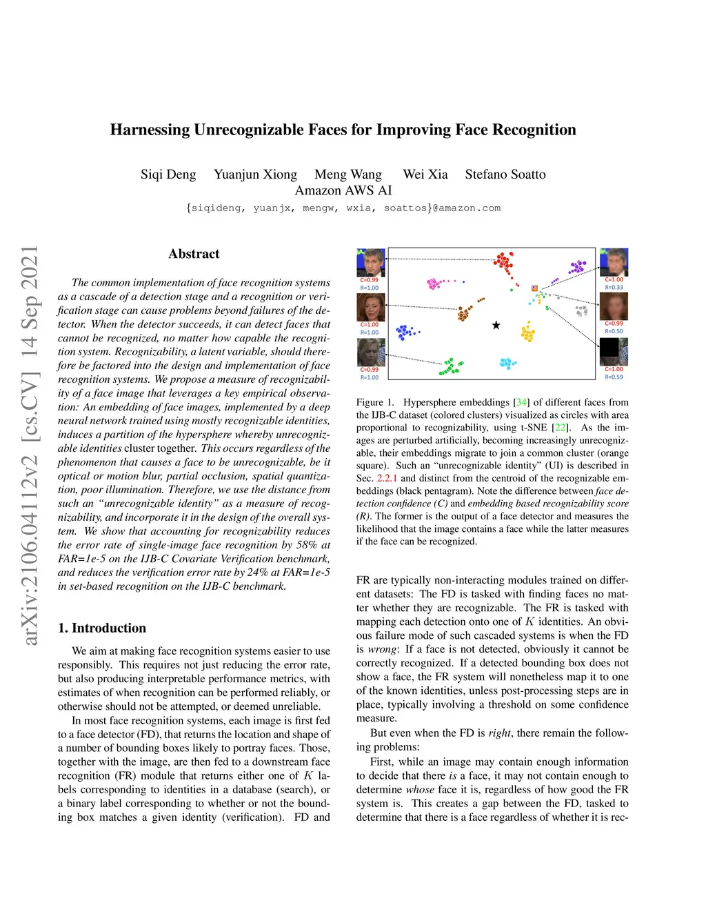 The common implementation of face recognition systems as a cascade of a detection stage and a recognition or verification stage can cause problems beyond failures of the detector. When the detector succeeds, it can detect faces that cannot be recognized, no matter how capable the recognition system. Recognizability, a latent variable, should therefore be factored into the design and implementation of face recognition systems. We propose a measure of recognizability of a face image that leverages a key empirical observation: an embedding of face images, implemented by a deep neural network trained using mostly recognizable identities, induces a partition of the hypersphere whereby unrecognizable identities cluster together. This occurs regardless of the phenomenon that causes a face to be unrecognizable, it be optical or motion blur, partial occlusion, spatial quantization, poor illumination. Therefore, we use the distance from such an "unrecognizable identity" as a measure of recognizability, and incorporate it in the design of the over-all system. We show that accounting for recognizability reduces error rate of single-image face recognition by 58% at FAR=1e-5 on the IJB-C Covariate Verification benchmark, and reduces verification error rate by 24% at FAR=1e-5 in set-based recognition on the IJB-C benchmark.