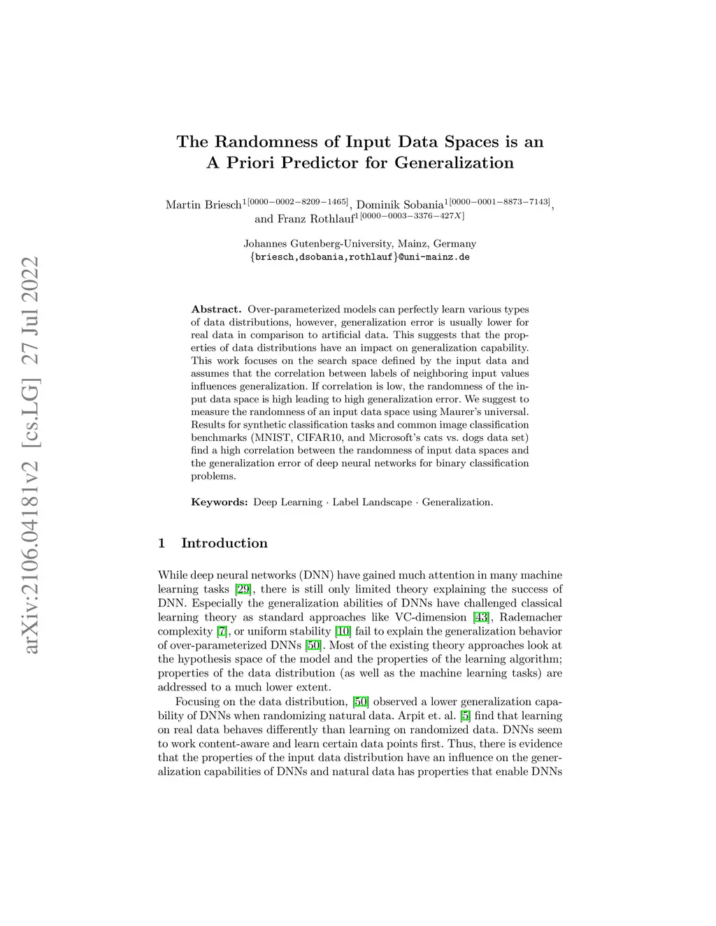 Over-parameterized models can perfectly learn various types of data distributions, however, generalization error is usually lower for real data in comparison to artificial data. This suggests that the properties of data distributions have an impact on generalization capability. This work focuses on the search space defined by the input data and assumes that the correlation between labels of neighboring input values influences generalization. If correlation is low, the randomness of the input data space is high leading to high generalization error. We suggest to measure the randomness of an input data space using Maurer's universal. Results for synthetic classification tasks and common image classification benchmarks (MNIST, CIFAR10, and Microsoft's cats vs. dogs data set) find a high correlation between the randomness of input data spaces and the generalization error of deep neural networks for binary classification problems.