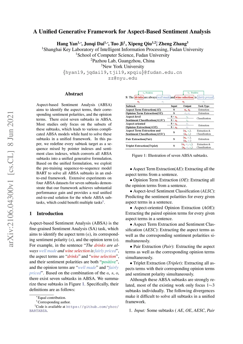 Aspect-based Sentiment Analysis (ABSA) aims to identify the aspect terms, their corresponding sentiment polarities, and the opinion terms. There exist seven subtasks in ABSA. Most studies only focus on the subsets of these subtasks, which leads to various complicated ABSA models while hard to solve these subtasks in a unified framework. In this paper, we redefine every subtask target as a sequence mixed by pointer indexes and sentiment class indexes, which converts all ABSA subtasks into a unified generative formulation. Based on the unified formulation, we exploit the pre-training sequence-to-sequence model BART to solve all ABSA subtasks in an end-to-end framework. Extensive experiments on four ABSA datasets for seven subtasks demonstrate that our framework achieves substantial performance gain and provides a real unified end-to-end solution for the whole ABSA subtasks, which could benefit multiple tasks.