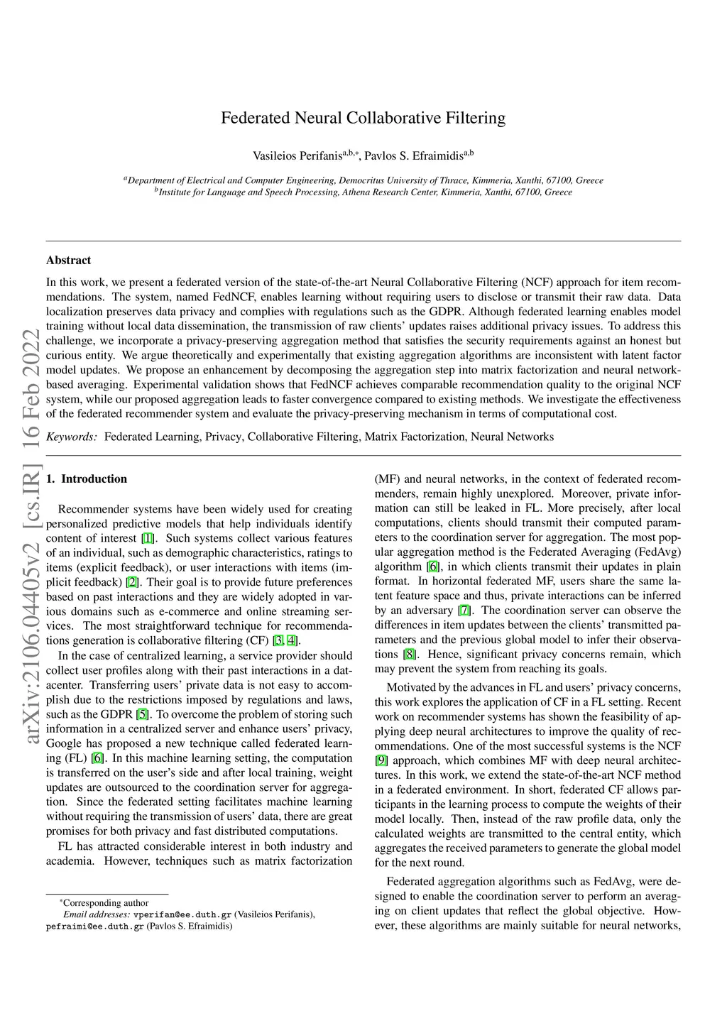 In this work, we present a federated version of the state-of-the-art Neural Collaborative Filtering (NCF) approach for item recommendations. The system, named FedNCF, allows learning without requiring users to expose or transmit their raw data. Experimental validation shows that FedNCF achieves comparable recommendation quality to the original NCF system. Although federated learning (FL) enables learning without raw data transmission, recent attacks showed that FL alone does not eliminate privacy concerns. To overcome this challenge, we integrate a privacy-preserving enhancement with a secure aggregation scheme that satisfies the security requirements against an honest-but-curious (HBC) entity, without affecting the quality of the original model. Finally, we discuss the peculiarities observed in the application of FL in a collaborative filtering (CF) task as well as we evaluate the privacy-preserving mechanism in terms of computational cost.