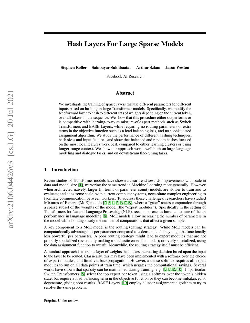 We investigate the training of sparse layers that use different parameters for different inputs based on hashing in large Transformer models. Specifically, we modify the feedforward layer to hash to different sets of weights depending on the current token, over all tokens in the sequence. We show that this procedure either outperforms or is competitive with learning-to-route mixture-of-expert methods such as Switch Transformers and BASE Layers, while requiring no routing parameters or extra terms in the objective function such as a load balancing loss, and no sophisticated assignment algorithm. We study the performance of different hashing techniques, hash sizes and input features, and show that balanced and random hashes focused on the most local features work best, compared to either learning clusters or using longer-range context. We show our approach works well both on large language modeling and dialogue tasks, and on downstream fine-tuning tasks.