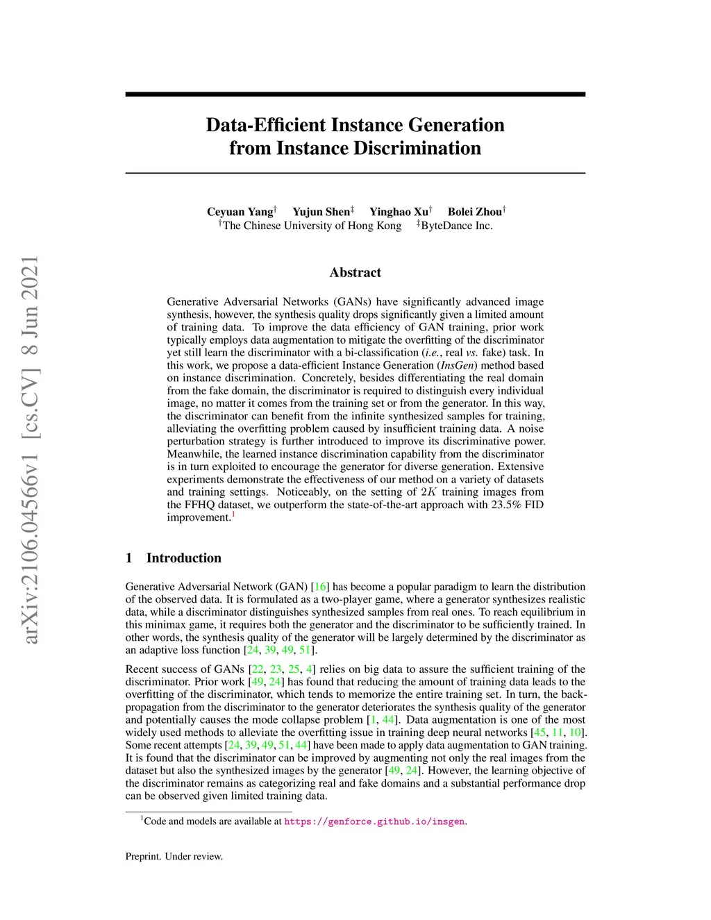 Generative Adversarial Networks (GANs) have significantly advanced image synthesis, however, the synthesis quality drops significantly given a limited amount of training data. To improve the data efficiency of GAN training, prior work typically employs data augmentation to mitigate the overfitting of the discriminator yet still learn the discriminator with a bi-classification (i.e., real vs. fake) task. In this work, we propose a data-efficient Instance Generation (InsGen) method based on instance discrimination. Concretely, besides differentiating the real domain from the fake domain, the discriminator is required to distinguish every individual image, no matter it comes from the training set or from the generator. In this way, the discriminator can benefit from the infinite synthesized samples for training, alleviating the overfitting problem caused by insufficient training data. A noise perturbation strategy is further introduced to improve its discriminative power. Meanwhile, the learned instance discrimination capability from the discriminator is in turn exploited to encourage the generator for diverse generation. Extensive experiments demonstrate the effectiveness of our method on a variety of datasets and training settings. Noticeably, on the setting of 2K training images from the FFHQ dataset, we outperform the state-of-the-art approach with 23.5% FID improvement.