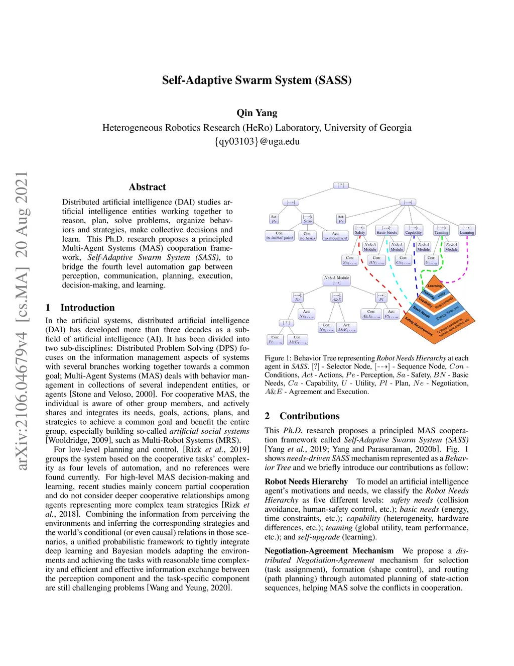 Distributed artificial intelligence (DAI) studies artificial intelligence entities working together to reason, plan, solve problems, organize behaviors and strategies, make collective decisions and learn. This Ph.D. research proposes a principled Multi-Agent Systems (MAS) cooperation framework -- Self-Adaptive Swarm System (SASS) -- to bridge the fourth level automation gap between perception, communication, planning, execution, decision-making, and learning.