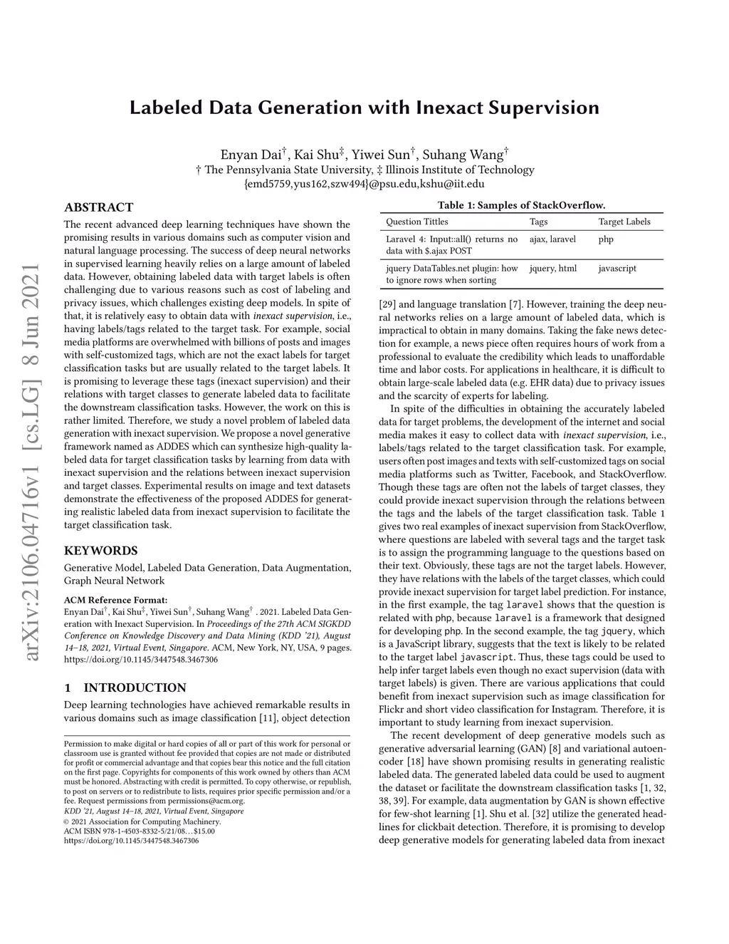 The recent advanced deep learning techniques have shown the promising results in various domains such as computer vision and natural language processing. The success of deep neural networks in supervised learning heavily relies on a large amount of labeled data. However, obtaining labeled data with target labels is often challenging due to various reasons such as cost of labeling and privacy issues, which challenges existing deep models. In spite of that, it is relatively easy to obtain data with \textit{inexact supervision}, i.e., having labels/tags related to the target task. For example, social media platforms are overwhelmed with billions of posts and images with self-customized tags, which are not the exact labels for target classification tasks but are usually related to the target labels. It is promising to leverage these tags (inexact supervision) and their relations with target classes to generate labeled data to facilitate the downstream classification tasks. However, the work on this is rather limited. Therefore, we study a novel problem of labeled data generation with inexact supervision. We propose a novel generative framework named as ADDES which can synthesize high-quality labeled data for target classification tasks by learning from data with inexact supervision and the relations between inexact supervision and target classes. Experimental results on image and text datasets demonstrate the effectiveness of the proposed ADDES for generating realistic labeled data from inexact supervision to facilitate the target classification task.