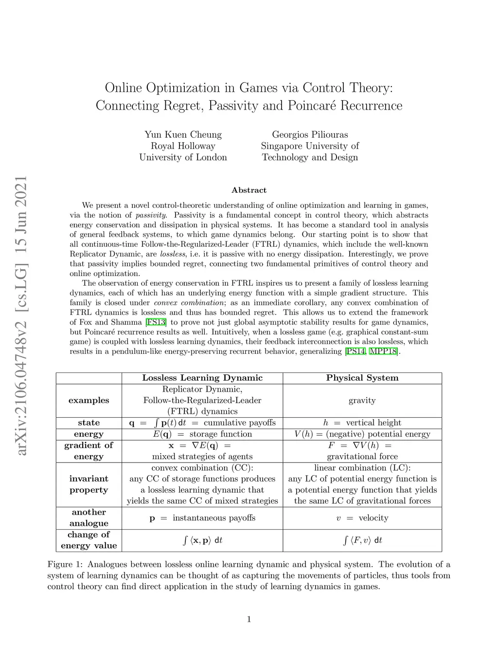 We present a novel control-theoretic understanding of online optimization and learning in games, via the notion of passivity. Passivity is a fundamental concept in control theory, which abstracts energy conservation and dissipation in physical systems. It has become a standard tool in analysis of general feedback systems, to which game dynamics belong. Our starting point is to show that all continuous-time Follow-the-Regularized-Leader (FTRL) dynamics, which include the well-known Replicator Dynamic, are lossless, i.e. it is passive with no energy dissipation. Interestingly, we prove that passivity implies bounded regret, connecting two fundamental primitives of control theory and online optimization. The observation of energy conservation in FTRL inspires us to present a family of lossless learning dynamics, each of which has an underlying energy function with a simple gradient structure. This family is closed under convex combination; as an immediate corollary, any convex combination of FTRL dynamics is lossless and thus has bounded regret. This allows us to extend the framework of Fox and Shamma [Games, 2013] to prove not just global asymptotic stability results for game dynamics, but Poincar\é recurrence results as well. Intuitively, when a lossless game (e.g. graphical constant-sum game) is coupled with lossless learning dynamics, their feedback interconnection is also lossless, which results in a pendulum-like energy-preserving recurrent behavior, generalizing the results of Piliouras and Shamma [SODA, 2014] and Mertikopoulos, Papadimitriou and Piliouras [SODA, 2018].