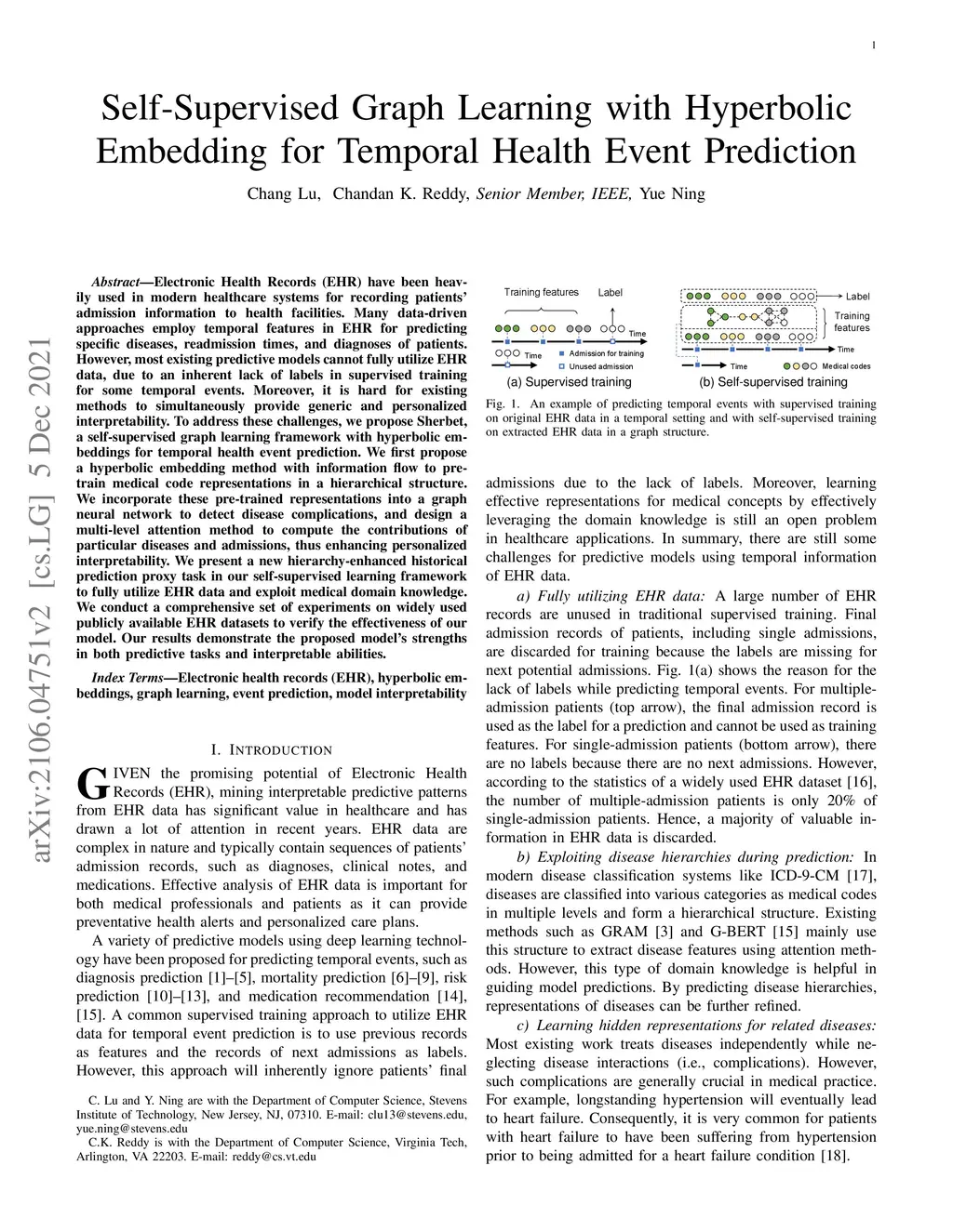 Electronic Health Records (EHR) have been heavily used in modern healthcare systems for recording patients' admission information to hospitals. Many data-driven approaches employ temporal features in EHR for predicting specific diseases, readmission times, or diagnoses of patients. However, most existing predictive models cannot fully utilize EHR data, due to an inherent lack of labels in supervised training for some temporal events. Moreover, it is hard for existing works to simultaneously provide generic and personalized interpretability. To address these challenges, we first propose a hyperbolic embedding method with information flow to pre-train medical code representations in a hierarchical structure. We incorporate these pre-trained representations into a graph neural network to detect disease complications, and design a multi-level attention method to compute the contributions of particular diseases and admissions, thus enhancing personalized interpretability. We present a new hierarchy-enhanced historical prediction proxy task in our self-supervised learning framework to fully utilize EHR data and exploit medical domain knowledge. We conduct a comprehensive set of experiments and case studies on widely used publicly available EHR datasets to verify the effectiveness of our model. The results demonstrate our model's strengths in both predictive tasks and interpretable abilities.