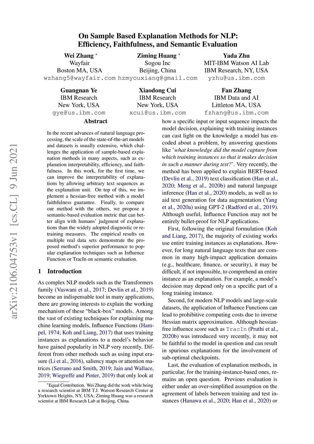 In the recent advances of natural language processing, the scale of the state-of-the-art models and datasets is usually extensive, which challenges the application of sample-based explanation methods in many aspects, such as explanation interpretability, efficiency, and faithfulness. In this work, for the first time, we can improve the interpretability of explanations by allowing arbitrary text sequences as the explanation unit. On top of this, we implement a hessian-free method with a model faithfulness guarantee. Finally, to compare our method with the others, we propose a semantic-based evaluation metric that can better align with humans' judgment of explanations than the widely adopted diagnostic or re-training measures. The empirical results on multiple real data sets demonstrate the proposed method's superior performance to popular explanation techniques such as Influence Function or TracIn on semantic evaluation.