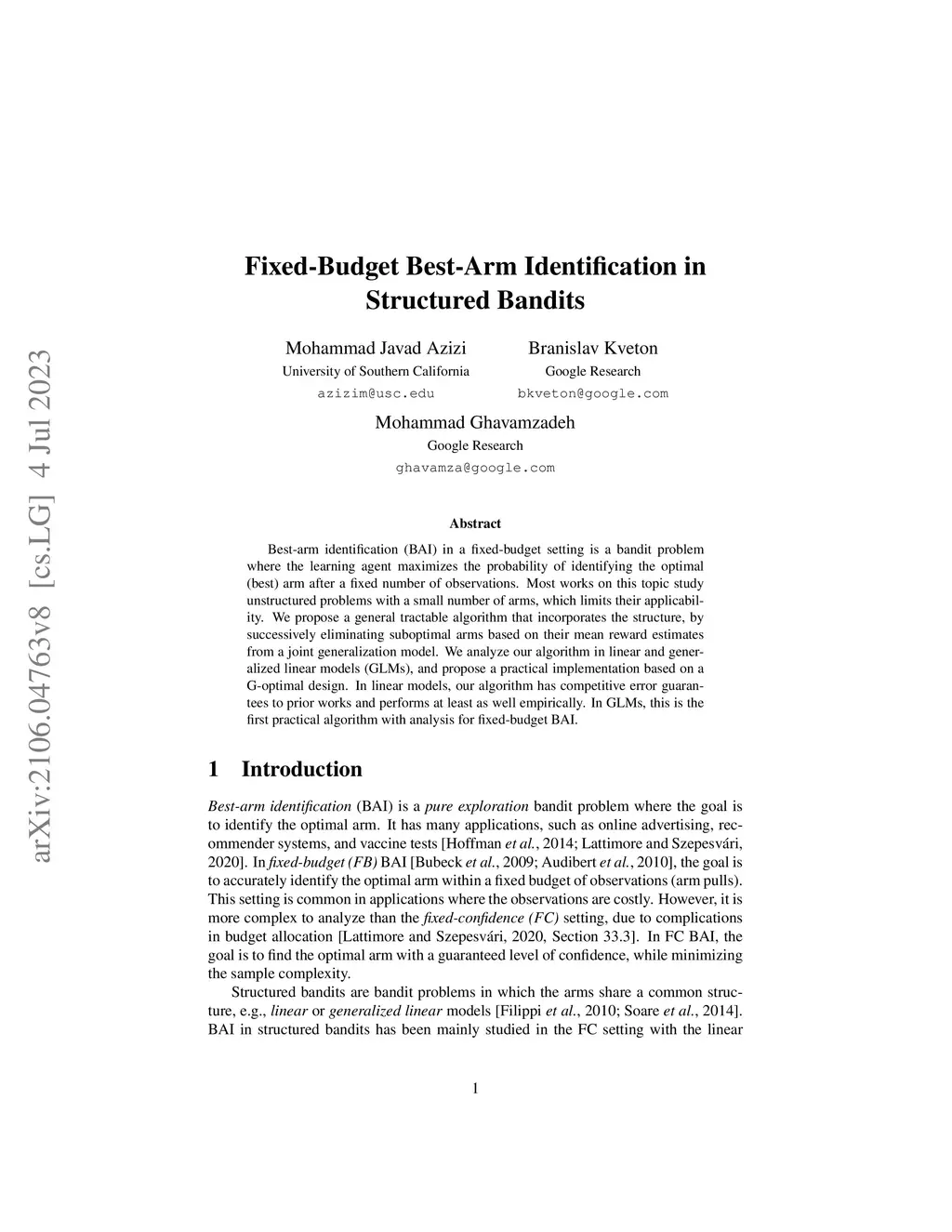 Best-arm identification (BAI) in a fixed-budget setting is a bandit problem where the learning agent maximizes the probability of identifying the best arm after a fixed number of observations. Most works on this topic study unstructured problems with a small number of arms, which limits their applicability. We propose a general tractable algorithm that incorporates the structure, by successively eliminating suboptimal arms based on their mean reward estimates from a joint generalization model. We analyze our algorithm in linear and generalized linear models (GLMs) and propose a practical implementation based on a G-optimal design. In linear models, our algorithm has competitive regret guarantees to prior works and performs at least as well empirically. In GLMs, this is the first practical algorithm with analysis for fixed-budget BAI.