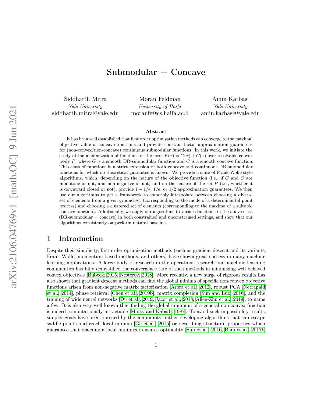 It has been well established that first order optimization methods can converge to the maximal objective value of concave functions and provide constant factor approximation guarantees for (non-convex/non-concave) continuous submodular functions. In this work, we initiate the study of the maximization of functions of the form over a solvable convex body , where is a smooth DR-submodular function and is a smooth concave function. This class of functions is a strict extension of both concave and continuous DR-submodular functions for which no theoretical guarantee is known. We provide a suite of Frank-Wolfe style algorithms, which, depending on the nature of the objective function (i.e., if and are monotone or not, and non-negative or not) and on the nature of the set (i.e., whether it is downward closed or not), provide , , or approximation guarantees. We then use our algorithms to get a framework to smoothly interpolate between choosing a diverse set of elements from a given ground set (corresponding to the mode of a determinantal point process) and choosing a clustered set of elements (corresponding to the maxima of a suitable concave function). Additionally, we apply our algorithms to various functions in the above class (DR-submodular + concave) in both constrained and unconstrained settings, and show that our algorithms consistently outperform natural baselines.