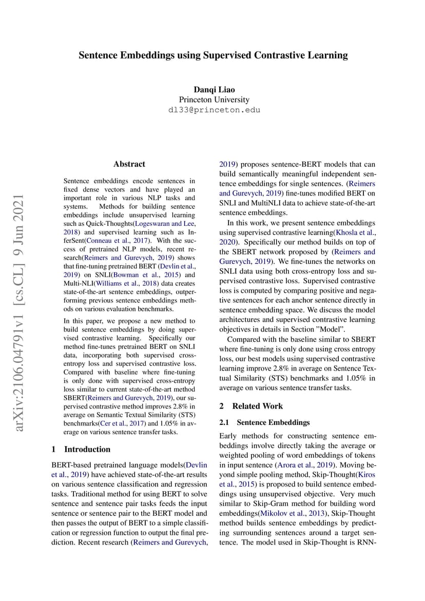Sentence embeddings encode sentences in fixed dense vectors and have played an important role in various NLP tasks and systems. Methods for building sentence embeddings include unsupervised learning such as Quick-Thoughts and supervised learning such as InferSent. With the success of pretrained NLP models, recent research shows that fine-tuning pretrained BERT on SNLI and Multi-NLI data creates state-of-the-art sentence embeddings, outperforming previous sentence embeddings methods on various evaluation benchmarks. In this paper, we propose a new method to build sentence embeddings by doing supervised contrastive learning. Specifically our method fine-tunes pretrained BERT on SNLI data, incorporating both supervised crossentropy loss and supervised contrastive loss. Compared with baseline where fine-tuning is only done with supervised cross-entropy loss similar to current state-of-the-art method SBERT, our supervised contrastive method improves 2.8% in average on Semantic Textual Similarity (STS) benchmarks and 1.05% in average on various sentence transfer tasks.