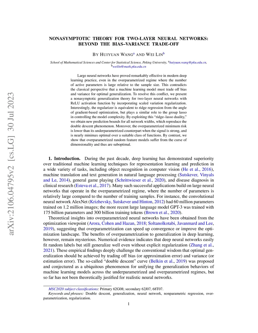 Large neural networks have proved remarkably effective in modern deep learning practice, even in the overparametrized regime where the number of active parameters is large relative to the sample size. This contradicts the classical perspective that a machine learning model must trade off bias and variance for optimal generalization. To resolve this conflict, we present a nonasymptotic generalization theory for two-layer neural networks with ReLU activation function by incorporating scaled variation regularization. Interestingly, the regularizer is equivalent to ridge regression from the angle of gradient-based optimization, but plays a similar role to the group lasso in controlling the model complexity. By exploiting this "ridge-lasso duality," we obtain new prediction bounds for all network widths, which reproduce the double descent phenomenon. Moreover, the overparametrized minimum risk is lower than its underparametrized counterpart when the signal is strong, and is nearly minimax optimal over a suitable class of functions. By contrast, we show that overparametrized random feature models suffer from the curse of dimensionality and thus are suboptimal.