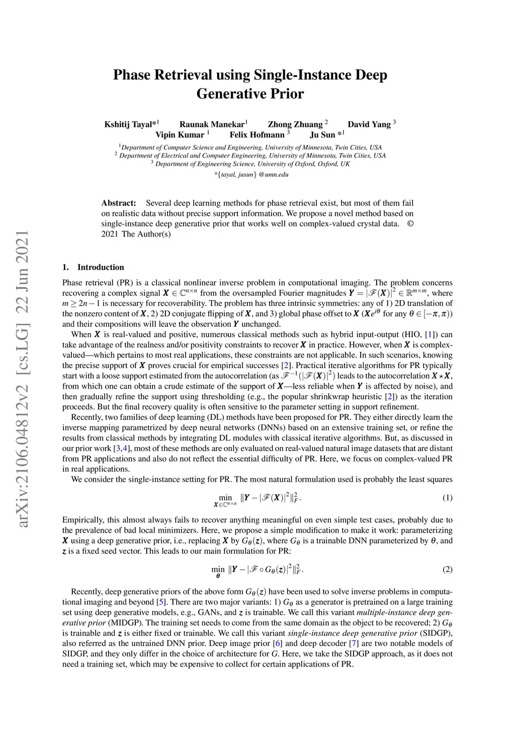 Several deep learning methods for phase retrieval exist, but most of them fail on realistic data without precise support information. We propose a novel method based on single-instance deep generative prior that works well on complex-valued crystal data.