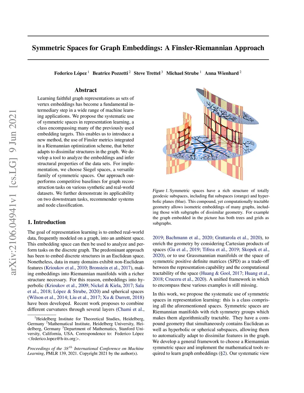 Learning faithful graph representations as sets of vertex embeddings has become a fundamental intermediary step in a wide range of machine learning applications. We propose the systematic use of symmetric spaces in representation learning, a class encompassing many of the previously used embedding targets. This enables us to introduce a new method, the use of Finsler metrics integrated in a Riemannian optimization scheme, that better adapts to dissimilar structures in the graph. We develop a tool to analyze the embeddings and infer structural properties of the data sets. For implementation, we choose Siegel spaces, a versatile family of symmetric spaces. Our approach outperforms competitive baselines for graph reconstruction tasks on various synthetic and real-world datasets. We further demonstrate its applicability on two downstream tasks, recommender systems and node classification.