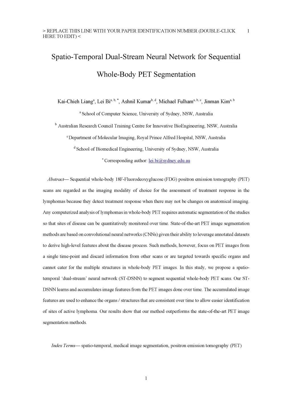 Sequential whole-body 18F-Fluorodeoxyglucose (FDG) positron emission tomography (PET) scans are regarded as the imaging modality of choice for the assessment of treatment response in the lymphomas because they detect treatment response when there may not be changes on anatomical imaging. Any computerized analysis of lymphomas in whole-body PET requires automatic segmentation of the studies so that sites of disease can be quantitatively monitored over time. State-of-the-art PET image segmentation methods are based on convolutional neural networks (CNNs) given their ability to leverage annotated datasets to derive high-level features about the disease process. Such methods, however, focus on PET images from a single time-point and discard information from other scans or are targeted towards specific organs and cannot cater for the multiple structures in whole-body PET images. In this study, we propose a spatio-temporal 'dual-stream' neural network (ST-DSNN) to segment sequential whole-body PET scans. Our ST-DSNN learns and accumulates image features from the PET images done over time. The accumulated image features are used to enhance the organs / structures that are consistent over time to allow easier identification of sites of active lymphoma. Our results show that our method outperforms the state-of-the-art PET image segmentation methods.