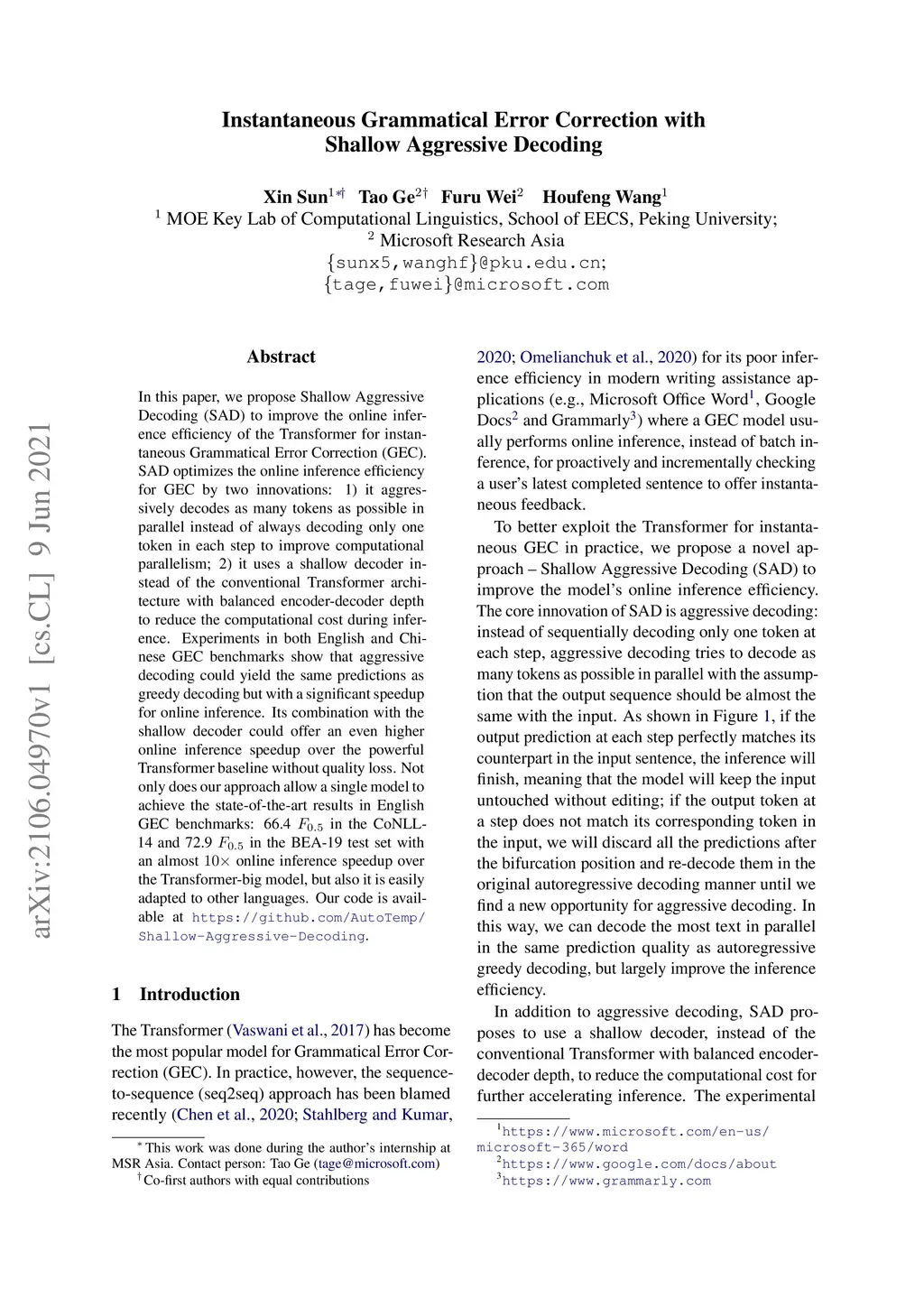 In this paper, we propose Shallow Aggressive Decoding (SAD) to improve the online inference efficiency of the Transformer for instantaneous Grammatical Error Correction (GEC). SAD optimizes the online inference efficiency for GEC by two innovations: 1) it aggressively decodes as many tokens as possible in parallel instead of always decoding only one token in each step to improve computational parallelism; 2) it uses a shallow decoder instead of the conventional Transformer architecture with balanced encoder-decoder depth to reduce the computational cost during inference. Experiments in both English and Chinese GEC benchmarks show that aggressive decoding could yield the same predictions as greedy decoding but with a significant speedup for online inference. Its combination with the shallow decoder could offer an even higher online inference speedup over the powerful Transformer baseline without quality loss. Not only does our approach allow a single model to achieve the state-of-the-art results in English GEC benchmarks: 66.4 F0.5 in the CoNLL-14 and 72.9 F0.5 in the BEA-19 test set with an almost 10x online inference speedup over the Transformer-big model, but also it is easily adapted to other languages. Our code is available at https://github.com/AutoTemp/Shallow-Aggressive-Decoding.