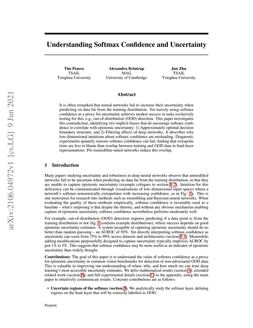 It is often remarked that neural networks fail to increase their uncertainty when predicting on data far from the training distribution. Yet naively using softmax confidence as a proxy for uncertainty achieves modest success in tasks exclusively testing for this, e.g., out-of-distribution (OOD) detection. This paper investigates this contradiction, identifying two implicit biases that do encourage softmax confidence to correlate with epistemic uncertainty: 1) Approximately optimal decision boundary structure, and 2) Filtering effects of deep networks. It describes why low-dimensional intuitions about softmax confidence are misleading. Diagnostic experiments quantify reasons softmax confidence can fail, finding that extrapolations are less to blame than overlap between training and OOD data in final-layer representations. Pre-trained/fine-tuned networks reduce this overlap.