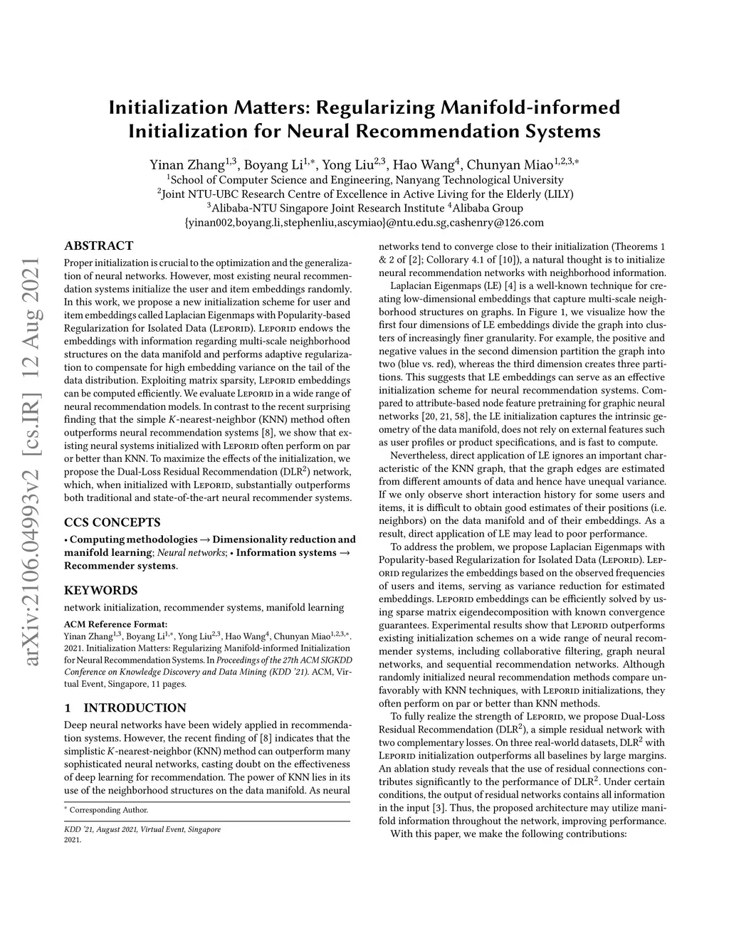 Proper initialization is crucial to the optimization and the generalization of neural networks. However, most existing neural recommendation systems initialize the user and item embeddings randomly. In this work, we propose a new initialization scheme for user and item embeddings called Laplacian Eigenmaps with Popularity-based Regularization for Isolated Data (LEPORID). LEPORID endows the embeddings with information regarding multi-scale neighborhood structures on the data manifold and performs adaptive regularization to compensate for high embedding variance on the tail of the data distribution. Exploiting matrix sparsity, LEPORID embeddings can be computed efficiently. We evaluate LEPORID in a wide range of neural recommendation models. In contrast to the recent surprising finding that the simple K-nearest-neighbor (KNN) method often outperforms neural recommendation systems, we show that existing neural systems initialized with LEPORID often perform on par or better than KNN. To maximize the effects of the initialization, we propose the Dual-Loss Residual Recommendation (DLR2) network, which, when initialized with LEPORID, substantially outperforms both traditional and state-of-the-art neural recommender systems.