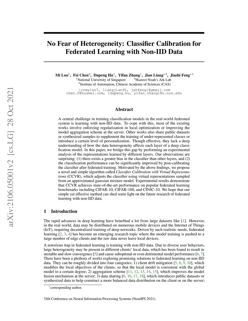 A central challenge in training classification models in the real-world federated system is learning with non-IID data. To cope with this, most of the existing works involve enforcing regularization in local optimization or improving the model aggregation scheme at the server. Other works also share public datasets or synthesized samples to supplement the training of under-represented classes or introduce a certain level of personalization. Though effective, they lack a deep understanding of how the data heterogeneity affects each layer of a deep classification model. In this paper, we bridge this gap by performing an experimental analysis of the representations learned by different layers. Our observations are surprising: (1) there exists a greater bias in the classifier than other layers, and (2) the classification performance can be significantly improved by post-calibrating the classifier after federated training. Motivated by the above findings, we propose a novel and simple algorithm called Classifier Calibration with Virtual Representations (CCVR), which adjusts the classifier using virtual representations sampled from an approximated gaussian mixture model. Experimental results demonstrate that CCVR achieves state-of-the-art performance on popular federated learning benchmarks including CIFAR-10, CIFAR-100, and CINIC-10. We hope that our simple yet effective method can shed some light on the future research of federated learning with non-IID data.