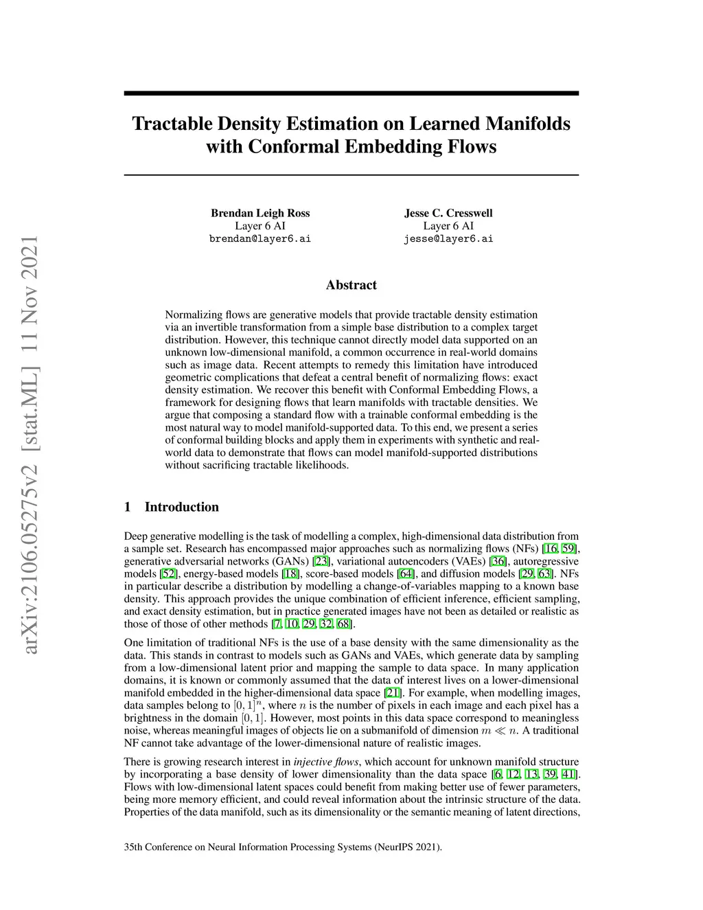 Normalizing flows are generative models that provide tractable density estimation via an invertible transformation from a simple base distribution to a complex target distribution. However, this technique cannot directly model data supported on an unknown low-dimensional manifold, a common occurrence in real-world domains such as image data. Recent attempts to remedy this limitation have introduced geometric complications that defeat a central benefit of normalizing flows: exact density estimation. We recover this benefit with Conformal Embedding Flows, a framework for designing flows that learn manifolds with tractable densities. We argue that composing a standard flow with a trainable conformal embedding is the most natural way to model manifold-supported data. To this end, we present a series of conformal building blocks and apply them in experiments with synthetic and real-world data to demonstrate that flows can model manifold-supported distributions without sacrificing tractable likelihoods.