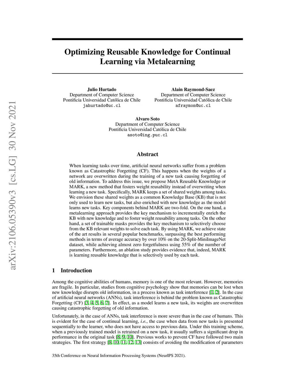 When learning tasks over time, artificial neural networks suffer from a problem known as Catastrophic Forgetting (CF). This happens when the weights of a network are overwritten during the training of a new task causing forgetting of old information. To address this issue, we propose MetA Reusable Knowledge or MARK, a new method that fosters weight reusability instead of overwriting when learning a new task. Specifically, MARK keeps a set of shared weights among tasks. We envision these shared weights as a common Knowledge Base (KB) that is not only used to learn new tasks, but also enriched with new knowledge as the model learns new tasks. Key components behind MARK are two-fold. On the one hand, a metalearning approach provides the key mechanism to incrementally enrich the KB with new knowledge and to foster weight reusability among tasks. On the other hand, a set of trainable masks provides the key mechanism to selectively choose from the KB relevant weights to solve each task. By using MARK, we achieve state of the art results in several popular benchmarks, surpassing the best performing methods in terms of average accuracy by over 10% on the 20-Split-MiniImageNet dataset, while achieving almost zero forgetfulness using 55% of the number of parameters. Furthermore, an ablation study provides evidence that, indeed, MARK is learning reusable knowledge that is selectively used by each task.