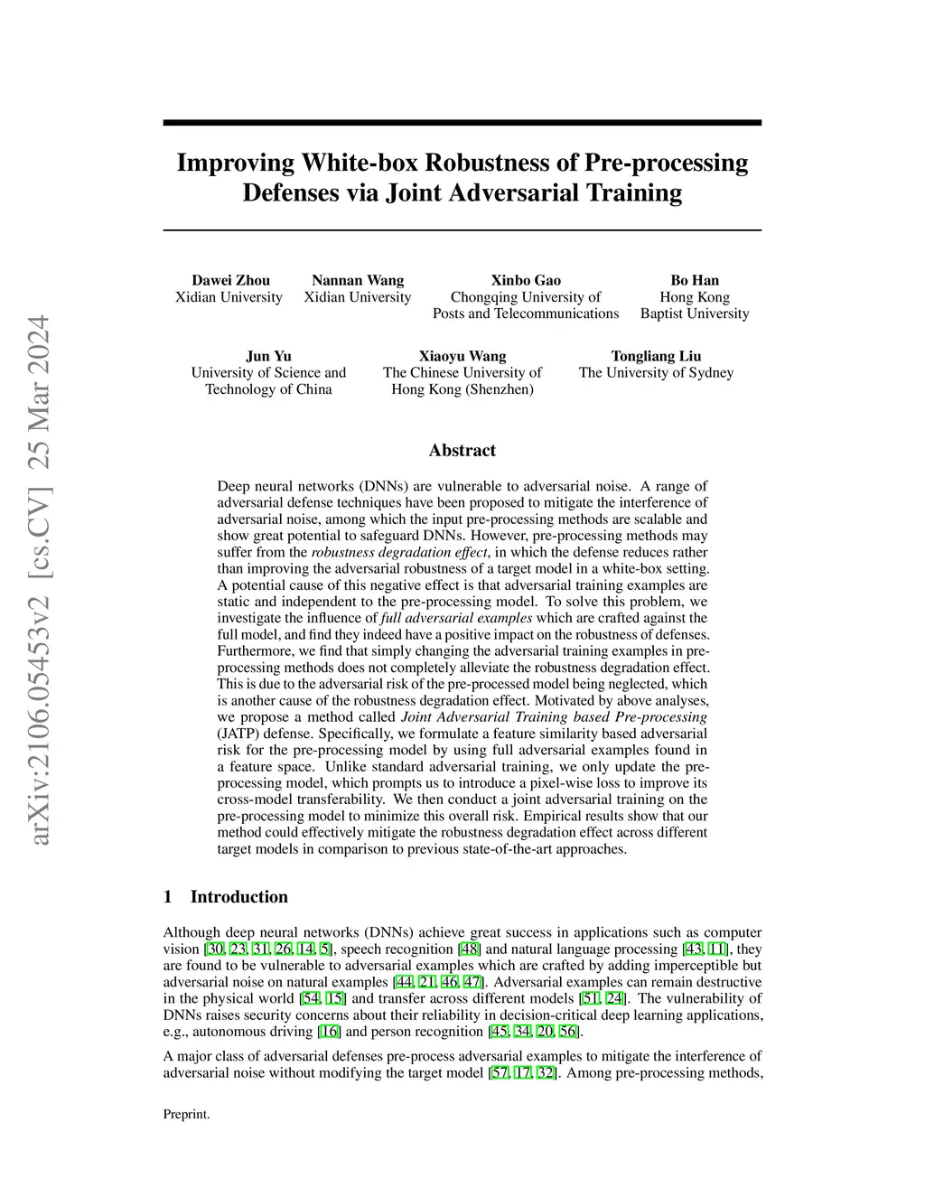 Deep neural networks (DNNs) are vulnerable to adversarial noise. A range of adversarial defense techniques have been proposed to mitigate the interference of adversarial noise, among which the input pre-processing methods are scalable and show great potential to safeguard DNNs. However, pre-processing methods may suffer from the robustness degradation effect, in which the defense reduces rather than improving the adversarial robustness of a target model in a white-box setting. A potential cause of this negative effect is that adversarial training examples are static and independent to the pre-processing model. To solve this problem, we investigate the influence of full adversarial examples which are crafted against the full model, and find they indeed have a positive impact on the robustness of defenses. Furthermore, we find that simply changing the adversarial training examples in pre-processing methods does not completely alleviate the robustness degradation effect. This is due to the adversarial risk of the pre-processed model being neglected, which is another cause of the robustness degradation effect. Motivated by above analyses, we propose a method called Joint Adversarial Training based Pre-processing (JATP) defense. Specifically, we formulate a feature similarity based adversarial risk for the pre-processing model by using full adversarial examples found in a feature space. Unlike standard adversarial training, we only update the pre-processing model, which prompts us to introduce a pixel-wise loss to improve its cross-model transferability. We then conduct a joint adversarial training on the pre-processing model to minimize this overall risk. Empirical results show that our method could effectively mitigate the robustness degradation effect across different target models in comparison to previous state-of-the-art approaches.