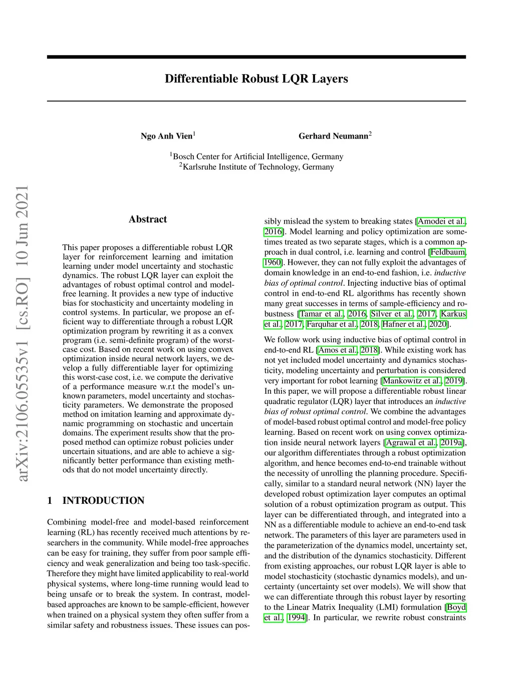 This paper proposes a differentiable robust LQR layer for reinforcement learning and imitation learning under model uncertainty and stochastic dynamics. The robust LQR layer can exploit the advantages of robust optimal control and model-free learning. It provides a new type of inductive bias for stochasticity and uncertainty modeling in control systems. In particular, we propose an efficient way to differentiate through a robust LQR optimization program by rewriting it as a convex program (i.e. semi-definite program) of the worst-case cost. Based on recent work on using convex optimization inside neural network layers, we develop a fully differentiable layer for optimizing this worst-case cost, i.e. we compute the derivative of a performance measure w.r.t the model's unknown parameters, model uncertainty and stochasticity parameters. We demonstrate the proposed method on imitation learning and approximate dynamic programming on stochastic and uncertain domains. The experiment results show that the proposed method can optimize robust policies under uncertain situations, and are able to achieve a significantly better performance than existing methods that do not model uncertainty directly.