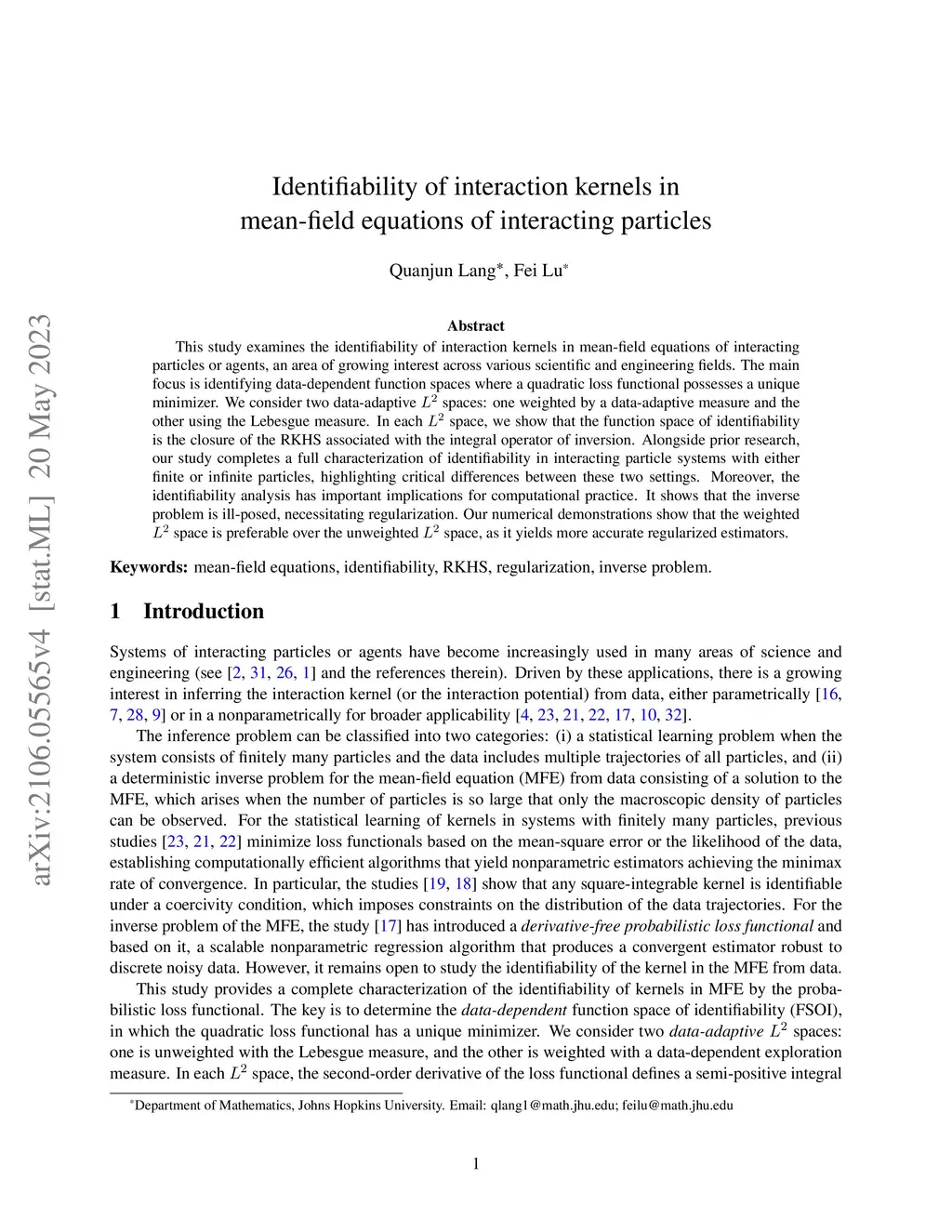 This study examines the identifiability of interaction kernels in mean-field equations of interacting particles or agents, an area of growing interest across various scientific and engineering fields. The main focus is identifying data-dependent function spaces where a quadratic loss functional possesses a unique minimizer. We consider two data-adaptive spaces: one weighted by a data-adaptive measure and the other using the Lebesgue measure. In each space, we show that the function space of identifiability is the closure of the RKHS associated with the integral operator of inversion. Alongside prior research, our study completes a full characterization of identifiability in interacting particle systems with either finite or infinite particles, highlighting critical differences between these two settings. Moreover, the identifiability analysis has important implications for computational practice. It shows that the inverse problem is ill-posed, necessitating regularization. Our numerical demonstrations show that the weighted space is preferable over the unweighted space, as it yields more accurate regularized estimators.