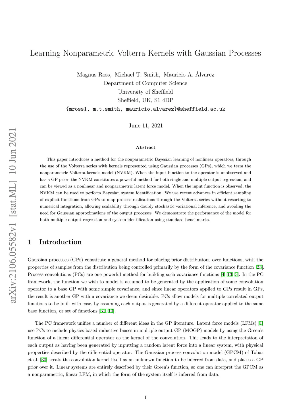 This paper introduces a method for the nonparametric Bayesian learning of nonlinear operators, through the use of the Volterra series with kernels represented using Gaussian processes (GPs), which we term the nonparametric Volterra kernels model (NVKM). When the input function to the operator is unobserved and has a GP prior, the NVKM constitutes a powerful method for both single and multiple output regression, and can be viewed as a nonlinear and nonparametric latent force model. When the input function is observed, the NVKM can be used to perform Bayesian system identification. We use recent advances in efficient sampling of explicit functions from GPs to map process realisations through the Volterra series without resorting to numerical integration, allowing scalability through doubly stochastic variational inference, and avoiding the need for Gaussian approximations of the output processes. We demonstrate the performance of the model for both multiple output regression and system identification using standard benchmarks.