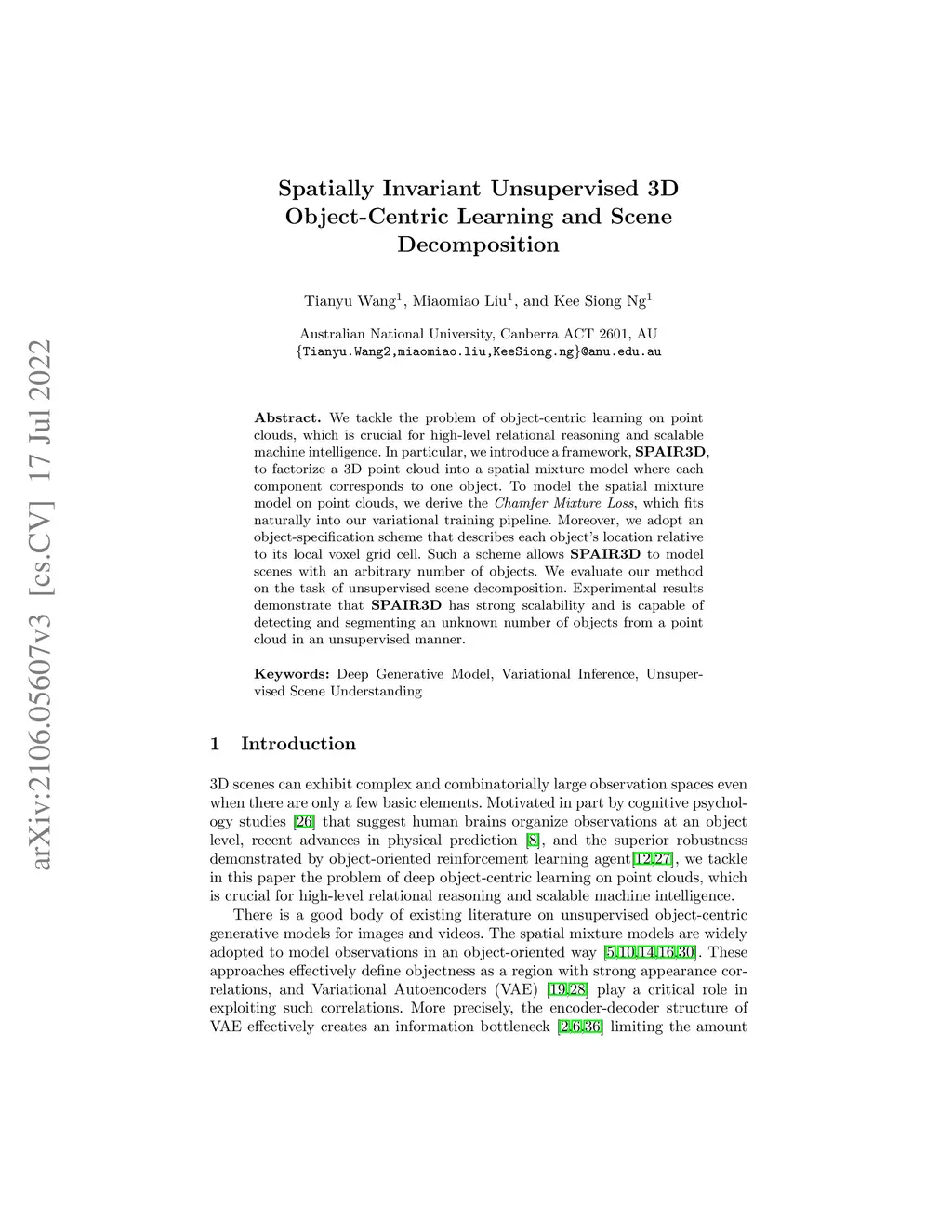 We tackle the problem of object-centric learning on point clouds, which is crucial for high-level relational reasoning and scalable machine intelligence. In particular, we introduce a framework, SPAIR3D, to factorize a 3D point cloud into a spatial mixture model where each component corresponds to one object. To model the spatial mixture model on point clouds, we derive the Chamfer Mixture Loss, which fits naturally into our variational training pipeline. Moreover, we adopt an object-specification scheme that describes each object's location relative to its local voxel grid cell. Such a scheme allows SPAIR3D to model scenes with an arbitrary number of objects. We evaluate our method on the task of unsupervised scene decomposition. Experimental results demonstrate that SPAIR3D has strong scalability and is capable of detecting and segmenting an unknown number of objects from a point cloud in an unsupervised manner.