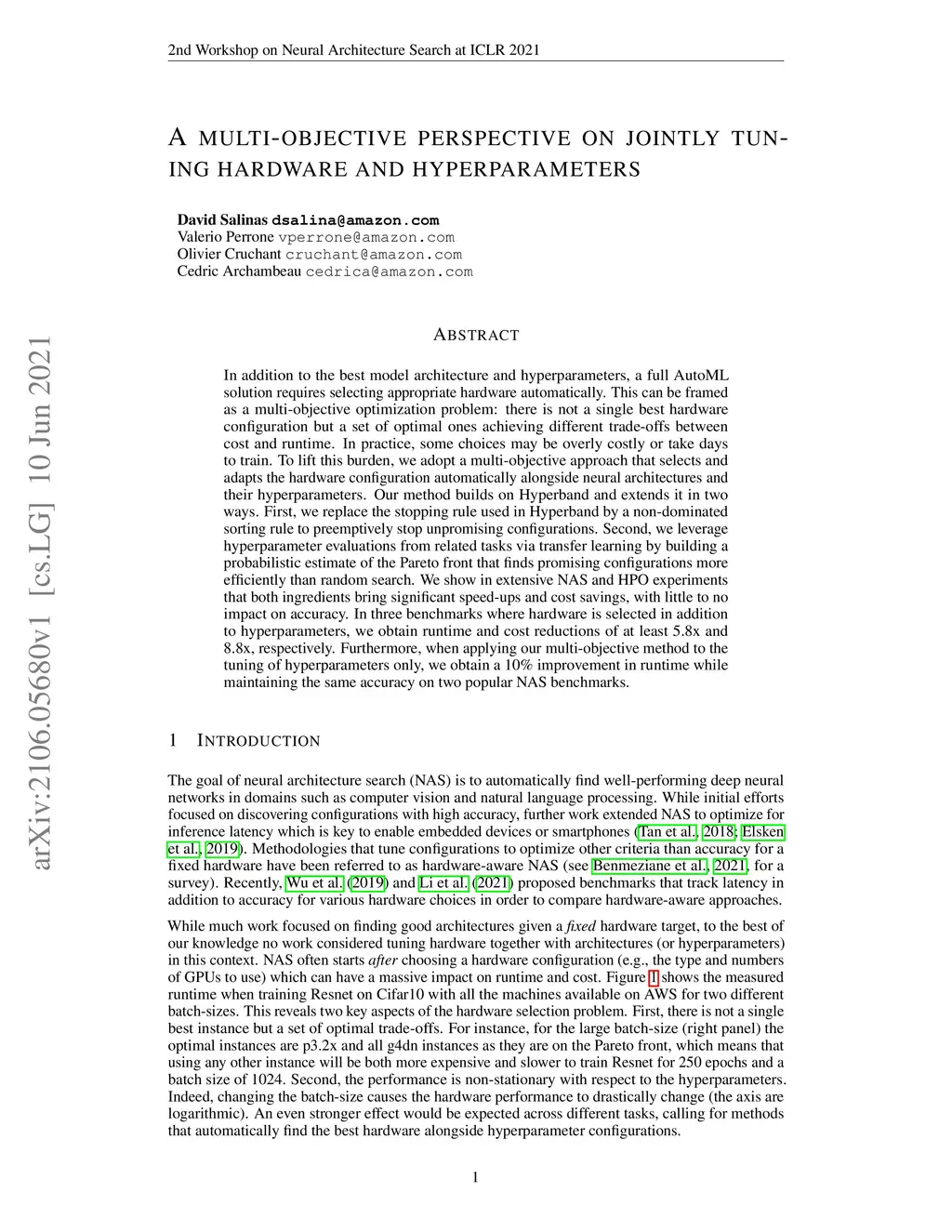 In addition to the best model architecture and hyperparameters, a full AutoML solution requires selecting appropriate hardware automatically. This can be framed as a multi-objective optimization problem: there is not a single best hardware configuration but a set of optimal ones achieving different trade-offs between cost and runtime. In practice, some choices may be overly costly or take days to train. To lift this burden, we adopt a multi-objective approach that selects and adapts the hardware configuration automatically alongside neural architectures and their hyperparameters. Our method builds on Hyperband and extends it in two ways. First, we replace the stopping rule used in Hyperband by a non-dominated sorting rule to preemptively stop unpromising configurations. Second, we leverage hyperparameter evaluations from related tasks via transfer learning by building a probabilistic estimate of the Pareto front that finds promising configurations more efficiently than random search. We show in extensive NAS and HPO experiments that both ingredients bring significant speed-ups and cost savings, with little to no impact on accuracy. In three benchmarks where hardware is selected in addition to hyperparameters, we obtain runtime and cost reductions of at least 5.8x and 8.8x, respectively. Furthermore, when applying our multi-objective method to the tuning of hyperparameters only, we obtain a 10\% improvement in runtime while maintaining the same accuracy on two popular NAS benchmarks.