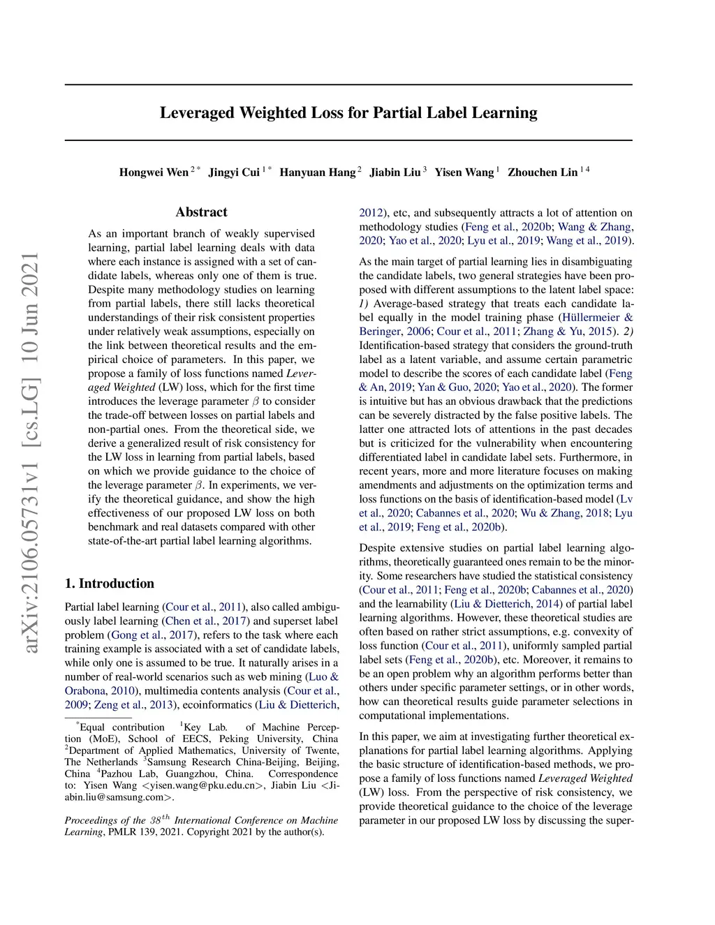 As an important branch of weakly supervised learning, partial label learning deals with data where each instance is assigned with a set of candidate labels, whereas only one of them is true. Despite many methodology studies on learning from partial labels, there still lacks theoretical understandings of their risk consistent properties under relatively weak assumptions, especially on the link between theoretical results and the empirical choice of parameters. In this paper, we propose a family of loss functions named \textit{Leveraged Weighted} (LW) loss, which for the first time introduces the leverage parameter to consider the trade-off between losses on partial labels and non-partial ones. From the theoretical side, we derive a generalized result of risk consistency for the LW loss in learning from partial labels, based on which we provide guidance to the choice of the leverage parameter . In experiments, we verify the theoretical guidance, and show the high effectiveness of our proposed LW loss on both benchmark and real datasets compared with other state-of-the-art partial label learning algorithms.