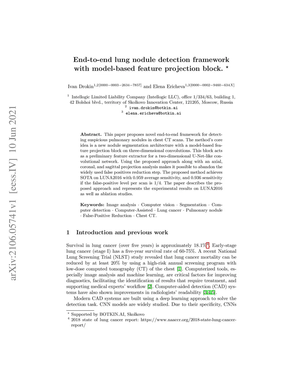 This paper proposes novel end-to-end framework for detecting suspicious pulmonary nodules in chest CT scans. The method core idea is a new nodule segmentation architecture with a model-based feature projection block on three-dimensional convolutions. This block acts as a preliminary feature extractor for a two-dimensional U-Net-like convolutional network. Using the proposed approach along with an axial, coronal, and sagittal projection analysis makes it possible to abandon the widely used false positives reduction step. The proposed method achieves SOTA on LUNA2016 with 0.959 average sensitivity, and 0.936 sensitivity if the false-positive level per scan is 0.25. The paper describes the proposed approach and represents the experimental results on LUNA2016 as well as ablation studies.
