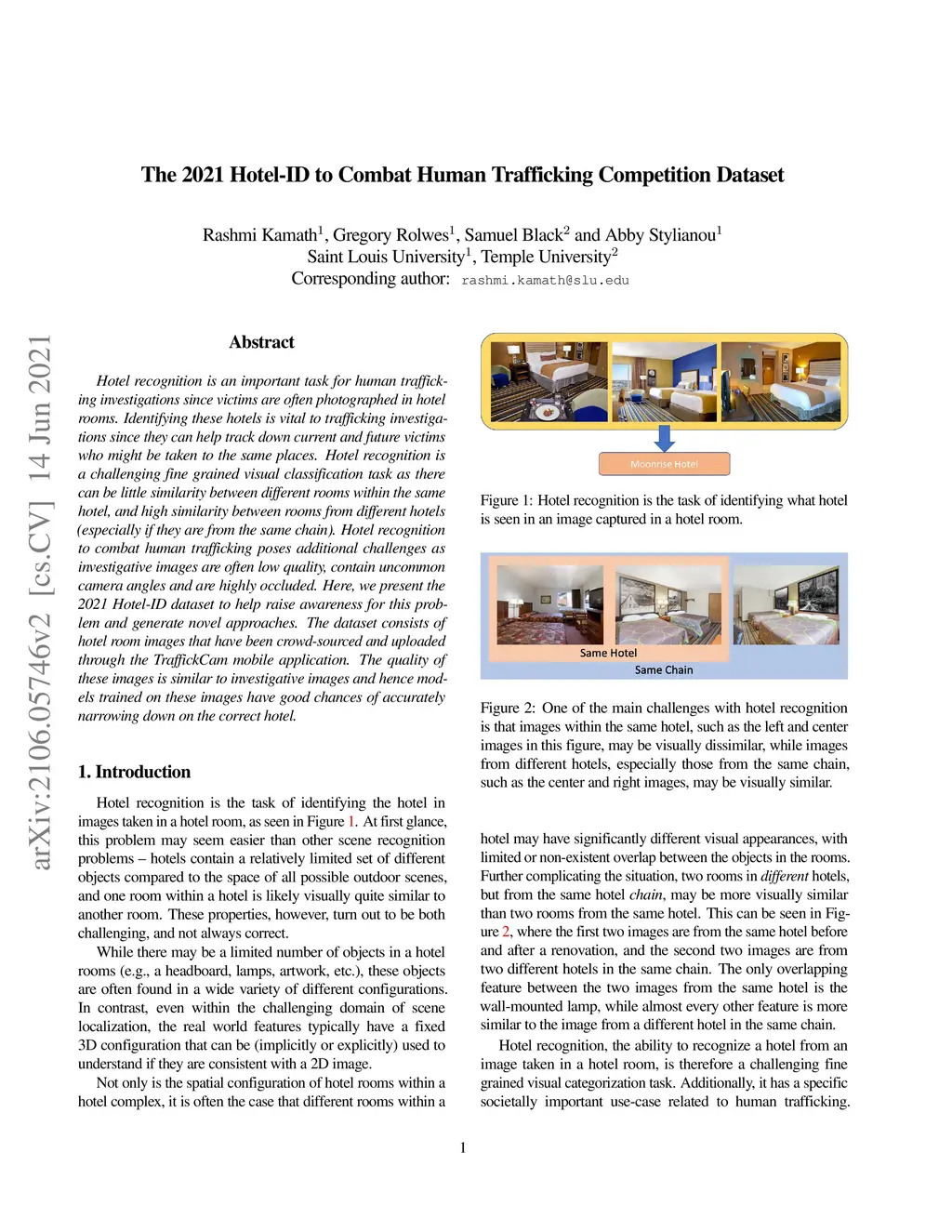 Hotel recognition is an important task for human trafficking investigations since victims are often photographed in hotel rooms. Identifying these hotels is vital to trafficking investigations since they can help track down current and future victims who might be taken to the same places. Hotel recognition is a challenging fine grained visual classification task as there can be little similarity between different rooms within the same hotel, and high similarity between rooms from different hotels (especially if they are from the same chain). Hotel recognition to combat human trafficking poses additional challenges as investigative images are often low quality, contain uncommon camera angles and are highly occluded. Here, we present the 2021 Hotel-ID dataset to help raise awareness for this problem and generate novel approaches. The dataset consists of hotel room images that have been crowd-sourced and uploaded through the TraffickCam mobile application. The quality of these images is similar to investigative images and hence models trained on these images have good chances of accurately narrowing down on the correct hotel.