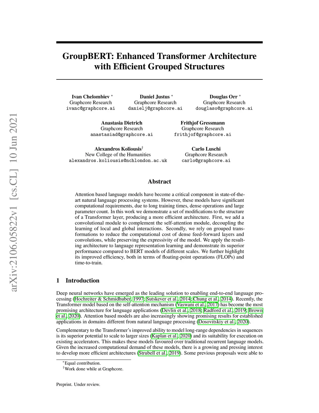 Attention based language models have become a critical component in state-of-the-art natural language processing systems. However, these models have significant computational requirements, due to long training times, dense operations and large parameter count. In this work we demonstrate a set of modifications to the structure of a Transformer layer, producing a more efficient architecture. First, we add a convolutional module to complement the self-attention module, decoupling the learning of local and global interactions. Secondly, we rely on grouped transformations to reduce the computational cost of dense feed-forward layers and convolutions, while preserving the expressivity of the model. We apply the resulting architecture to language representation learning and demonstrate its superior performance compared to BERT models of different scales. We further highlight its improved efficiency, both in terms of floating-point operations (FLOPs) and time-to-train.