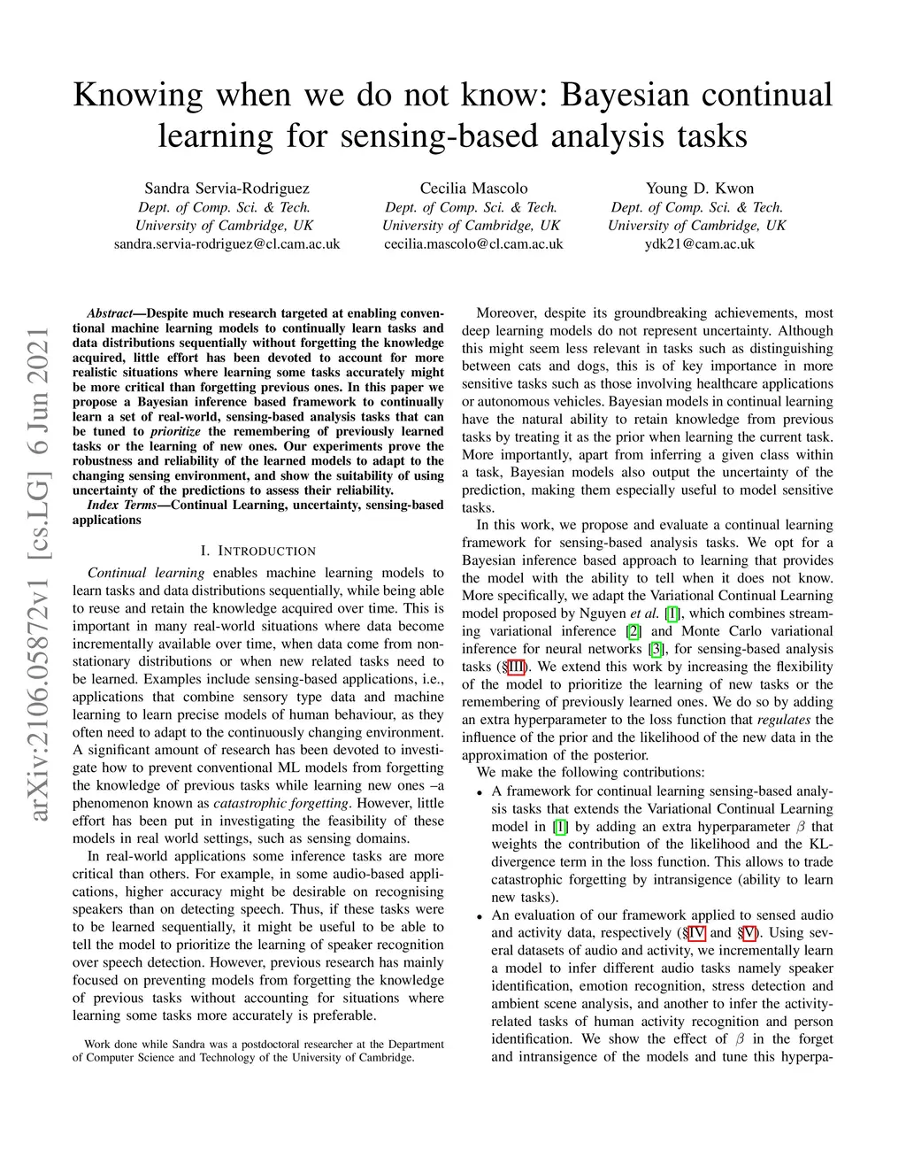 Despite much research targeted at enabling conventional machine learning models to continually learn tasks and data distributions sequentially without forgetting the knowledge acquired, little effort has been devoted to account for more realistic situations where learning some tasks accurately might be more critical than forgetting previous ones. In this paper we propose a Bayesian inference based framework to continually learn a set of real-world, sensing-based analysis tasks that can be tuned to prioritize the remembering of previously learned tasks or the learning of new ones. Our experiments prove the robustness and reliability of the learned models to adapt to the changing sensing environment, and show the suitability of using uncertainty of the predictions to assess their reliability.