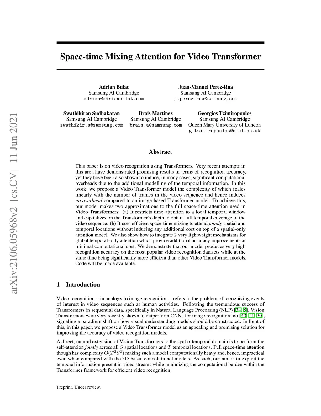 This paper is on video recognition using Transformers. Very recent attempts in this area have demonstrated promising results in terms of recognition accuracy, yet they have been also shown to induce, in many cases, significant computational overheads due to the additional modelling of the temporal information. In this work, we propose a Video Transformer model the complexity of which scales linearly with the number of frames in the video sequence and hence induces no overhead compared to an image-based Transformer model. To achieve this, our model makes two approximations to the full space-time attention used in Video Transformers: (a) It restricts time attention to a local temporal window and capitalizes on the Transformer's depth to obtain full temporal coverage of the video sequence. (b) It uses efficient space-time mixing to attend jointly spatial and temporal locations without inducing any additional cost on top of a spatial-only attention model. We also show how to integrate 2 very lightweight mechanisms for global temporal-only attention which provide additional accuracy improvements at minimal computational cost. We demonstrate that our model produces very high recognition accuracy on the most popular video recognition datasets while at the same time being significantly more efficient than other Video Transformer models. Code will be made available.