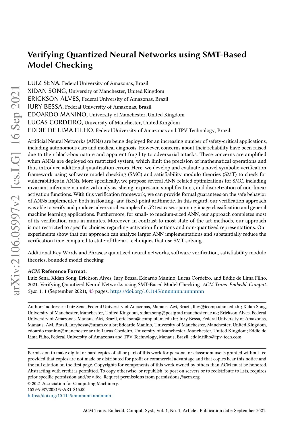 Artificial Neural Networks (ANNs) are being deployed for an increasing number of safety-critical applications, including autonomous cars and medical diagnosis. However, concerns about their reliability have been raised due to their black-box nature and apparent fragility to adversarial attacks. These concerns are amplified when ANNs are deployed on restricted system, which limit the precision of mathematical operations and thus introduce additional quantization errors. Here, we develop and evaluate a novel symbolic verification framework using software model checking (SMC) and satisfiability modulo theories (SMT) to check for vulnerabilities in ANNs. More specifically, we propose several ANN-related optimizations for SMC, including invariant inference via interval analysis, slicing, expression simplifications, and discretization of non-linear activation functions. With this verification framework, we can provide formal guarantees on the safe behavior of ANNs implemented both in floating- and fixed-point arithmetic. In this regard, our verification approach was able to verify and produce adversarial examples for test cases spanning image classification and general machine learning applications. Furthermore, for small- to medium-sized ANN, our approach completes most of its verification runs in minutes. Moreover, in contrast to most state-of-the-art methods, our approach is not restricted to specific choices regarding activation functions and non-quantized representations. Our experiments show that our approach can analyze larger ANN implementations and substantially reduce the verification time compared to state-of-the-art techniques that use SMT solving.