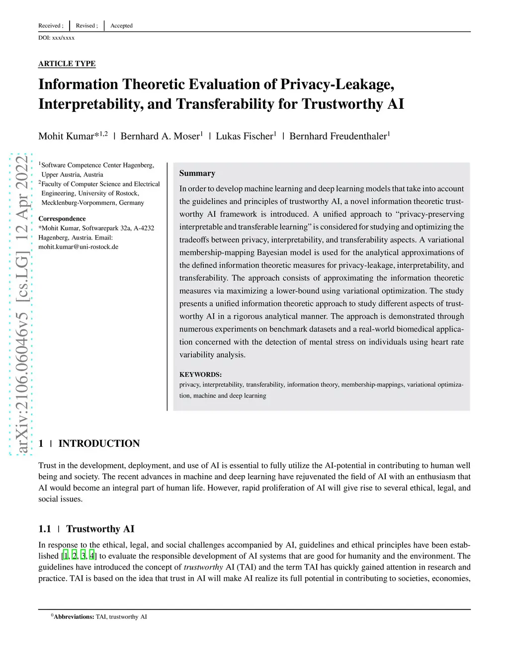 In order to develop machine learning and deep learning models that take into account the guidelines and principles of trustworthy AI, a novel information theoretic trustworthy AI framework is introduced. A unified approach to "privacy-preserving interpretable and transferable learning" is considered for studying and optimizing the tradeoffs between privacy, interpretability, and transferability aspects. A variational membership-mapping Bayesian model is used for the analytical approximations of the defined information theoretic measures for privacy-leakage, interpretability, and transferability. The approach consists of approximating the information theoretic measures via maximizing a lower-bound using variational optimization. The study presents a unified information theoretic approach to study different aspects of trustworthy AI in a rigorous analytical manner. The approach is demonstrated through numerous experiments on benchmark datasets and a real-world biomedical application concerned with the detection of mental stress on individuals using heart rate variability analysis.