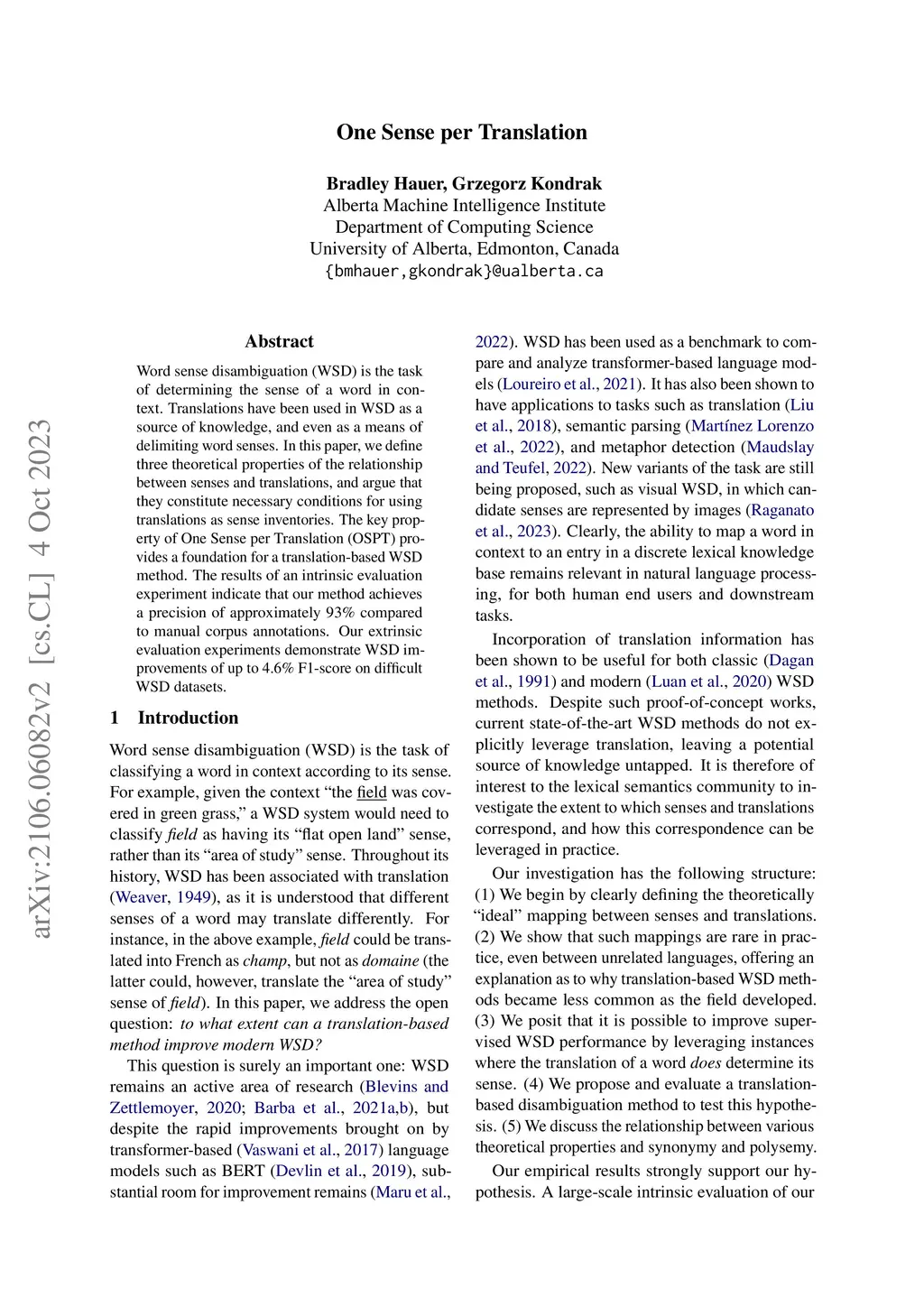 Word sense disambiguation (WSD) is the task of determining the sense of a word in context. Translations have been used in WSD as a source of knowledge, and even as a means of delimiting word senses. In this paper, we define three theoretical properties of the relationship between senses and translations, and argue that they constitute necessary conditions for using translations as sense inventories. The key property of One Sense per Translation (OSPT) provides a foundation for a translation-based WSD method. The results of an intrinsic evaluation experiment indicate that our method achieves a precision of approximately 93% compared to manual corpus annotations. Our extrinsic evaluation experiments demonstrate WSD improvements of up to 4.6% F1-score on difficult WSD datasets.