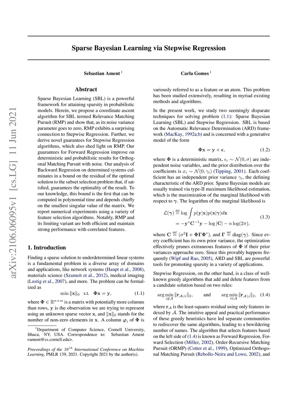 Sparse Bayesian Learning (SBL) is a powerful framework for attaining sparsity in probabilistic models. Herein, we propose a coordinate ascent algorithm for SBL termed Relevance Matching Pursuit (RMP) and show that, as its noise variance parameter goes to zero, RMP exhibits a surprising connection to Stepwise Regression. Further, we derive novel guarantees for Stepwise Regression algorithms, which also shed light on RMP. Our guarantees for Forward Regression improve on deterministic and probabilistic results for Orthogonal Matching Pursuit with noise. Our analysis of Backward Regression on determined systems culminates in a bound on the residual of the optimal solution to the subset selection problem that, if satisfied, guarantees the optimality of the result. To our knowledge, this bound is the first that can be computed in polynomial time and depends chiefly on the smallest singular value of the matrix. We report numerical experiments using a variety of feature selection algorithms. Notably, RMP and its limiting variant are both efficient and maintain strong performance with correlated features.