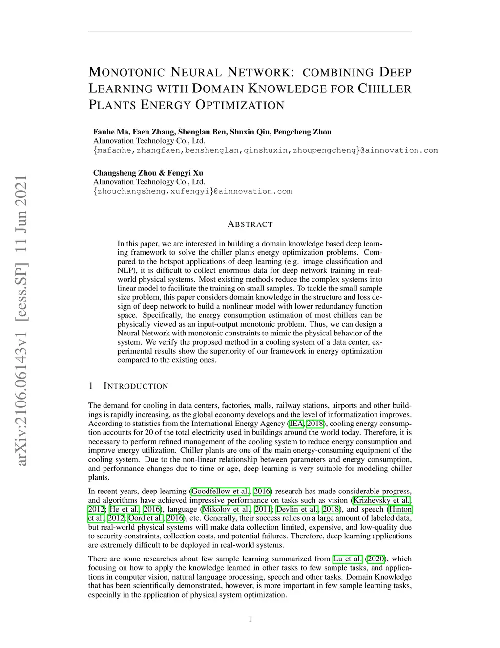 In this paper, we are interested in building a domain knowledge based deep learning framework to solve the chiller plants energy optimization problems. Compared to the hotspot applications of deep learning (e.g. image classification and NLP), it is difficult to collect enormous data for deep network training in real-world physical systems. Most existing methods reduce the complex systems into linear model to facilitate the training on small samples. To tackle the small sample size problem, this paper considers domain knowledge in the structure and loss design of deep network to build a nonlinear model with lower redundancy function space. Specifically, the energy consumption estimation of most chillers can be physically viewed as an input-output monotonic problem. Thus, we can design a Neural Network with monotonic constraints to mimic the physical behavior of the system. We verify the proposed method in a cooling system of a data center, experimental results show the superiority of our framework in energy optimization compared to the existing ones.
