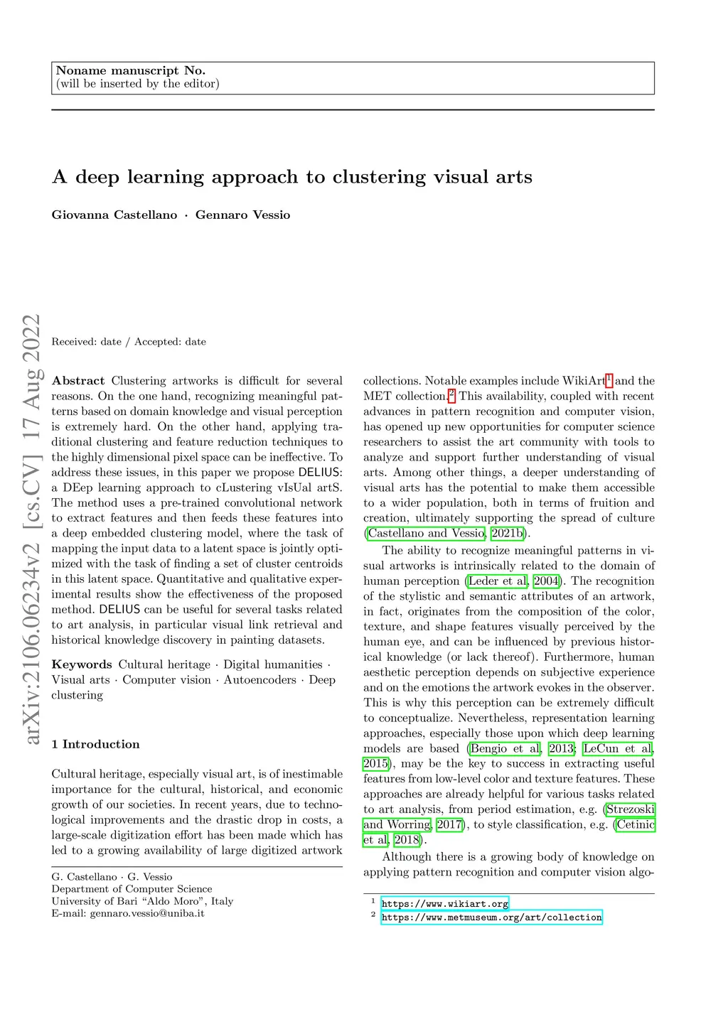 Clustering artworks is difficult for several reasons. On the one hand, recognizing meaningful patterns based on domain knowledge and visual perception is extremely hard. On the other hand, applying traditional clustering and feature reduction techniques to the highly dimensional pixel space can be ineffective. To address these issues, in this paper we propose DELIUS: a DEep learning approach to cLustering vIsUal artS. The method uses a pre-trained convolutional network to extract features and then feeds these features into a deep embedded clustering model, where the task of mapping the input data to a latent space is jointly optimized with the task of finding a set of cluster centroids in this latent space. Quantitative and qualitative experimental results show the effectiveness of the proposed method. DELIUS can be useful for several tasks related to art analysis, in particular visual link retrieval and historical knowledge discovery in painting datasets.