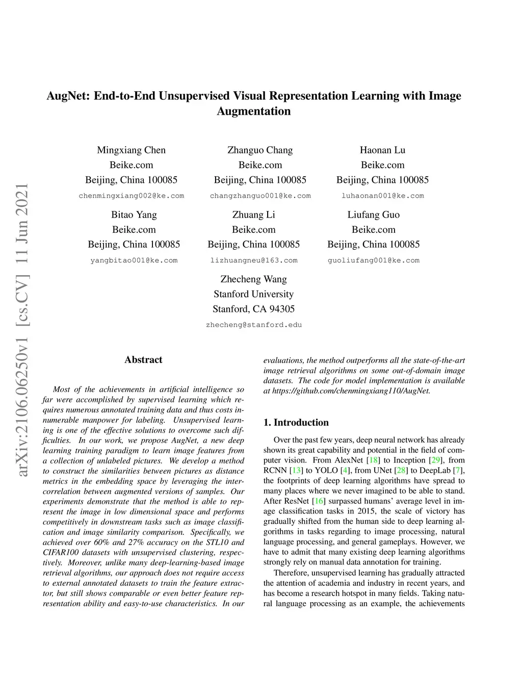 AugNet: End-to-End Unsupervised Visual Representation Learning with