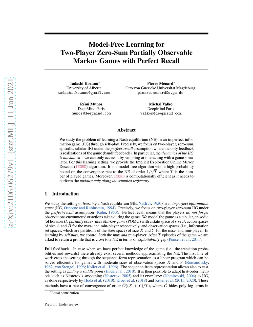 We study the problem of learning a Nash equilibrium (NE) in an imperfect information game (IIG) through self-play. Precisely, we focus on two-player, zero-sum, episodic, tabular IIG under the perfect-recall assumption where the only feedback is realizations of the game (bandit feedback). In particular, the dynamic of the IIG is not known -- we can only access it by sampling or interacting with a game simulator. For this learning setting, we provide the Implicit Exploration Online Mirror Descent (IXOMD) algorithm. It is a model-free algorithm with a high-probability bound on the convergence rate to the NE of order where is the number of played games. Moreover, IXOMD is computationally efficient as it needs to perform the updates only along the sampled trajectory.