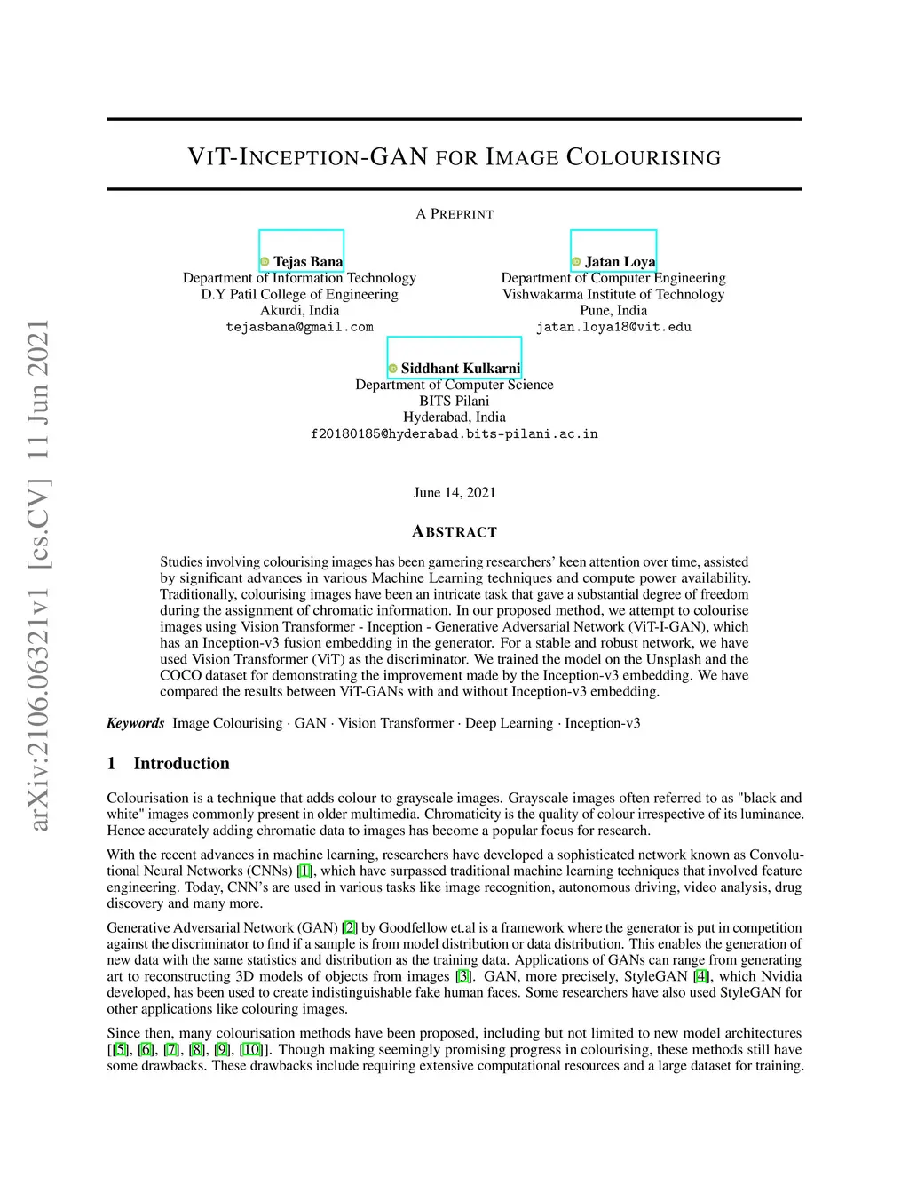Studies involving colourising images has been garnering researchers' keen attention over time, assisted by significant advances in various Machine Learning techniques and compute power availability. Traditionally, colourising images have been an intricate task that gave a substantial degree of freedom during the assignment of chromatic information. In our proposed method, we attempt to colourise images using Vision Transformer - Inception - Generative Adversarial Network (ViT-I-GAN), which has an Inception-v3 fusion embedding in the generator. For a stable and robust network, we have used Vision Transformer (ViT) as the discriminator. We trained the model on the Unsplash and the COCO dataset for demonstrating the improvement made by the Inception-v3 embedding. We have compared the results between ViT-GANs with and without Inception-v3 embedding.