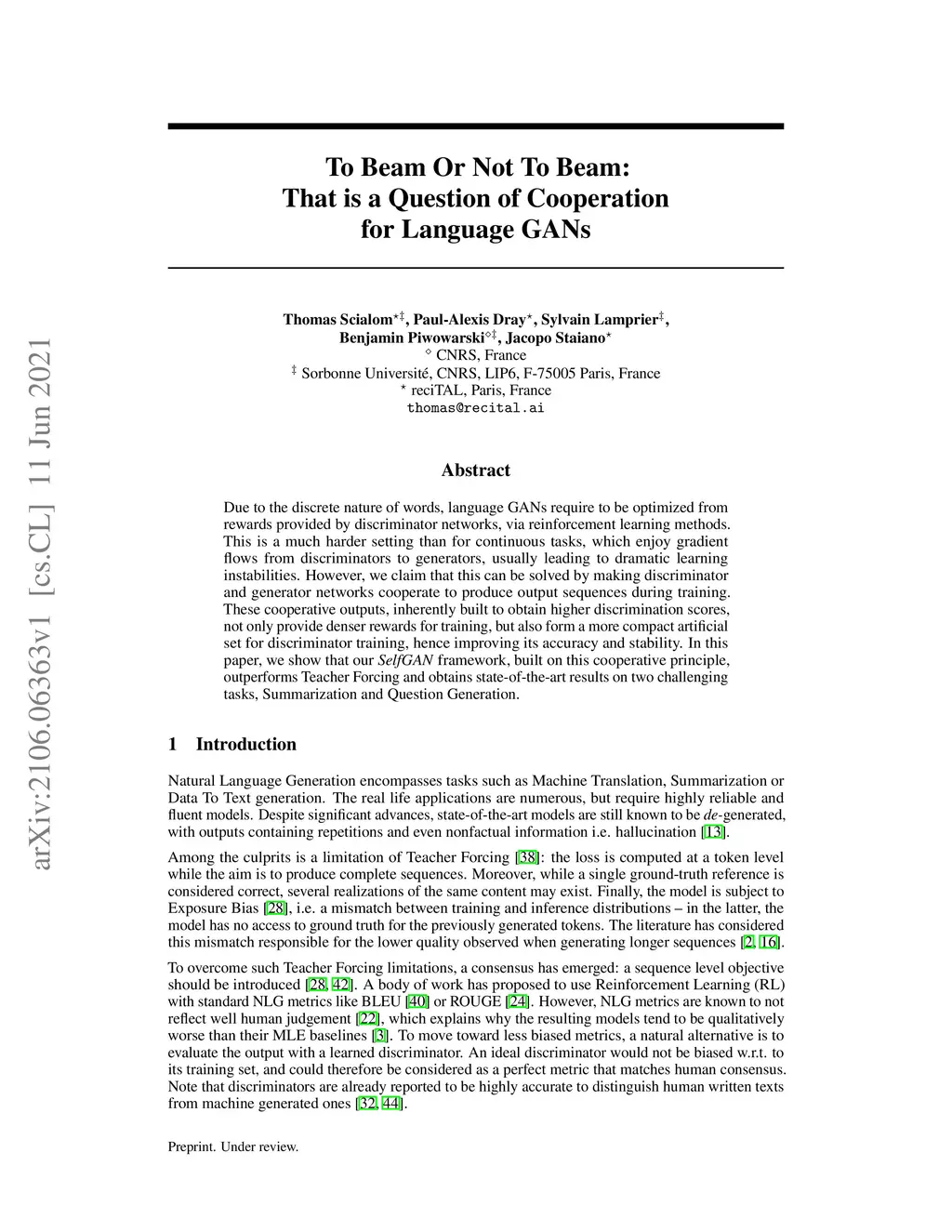Due to the discrete nature of words, language GANs require to be optimized from rewards provided by discriminator networks, via reinforcement learning methods. This is a much harder setting than for continuous tasks, which enjoy gradient flows from discriminators to generators, usually leading to dramatic learning instabilities. However, we claim that this can be solved by making discriminator and generator networks cooperate to produce output sequences during training. These cooperative outputs, inherently built to obtain higher discrimination scores, not only provide denser rewards for training, but also form a more compact artificial set for discriminator training, hence improving its accuracy and stability. In this paper, we show that our SelfGAN framework, built on this cooperative principle, outperforms Teacher Forcing and obtains state-of-the-art results on two challenging tasks, Summarization and Question Generation.