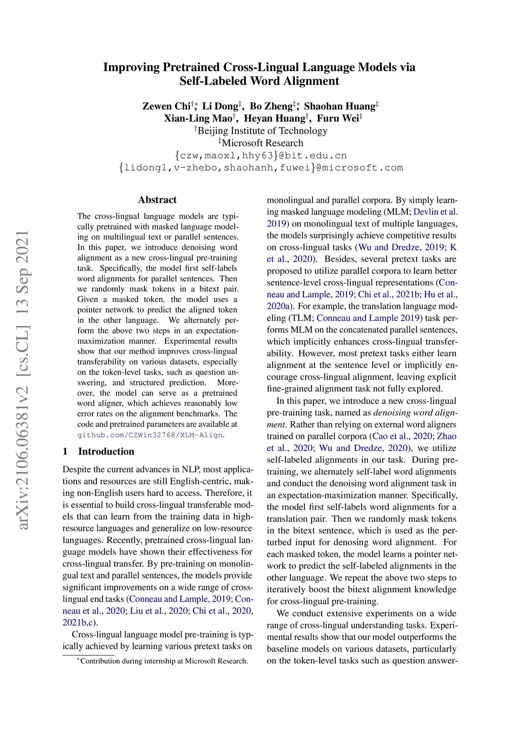 The cross-lingual language models are typically pretrained with masked language modeling on multilingual text or parallel sentences. In this paper, we introduce denoising word alignment as a new cross-lingual pre-training task. Specifically, the model first self-labels word alignments for parallel sentences. Then we randomly mask tokens in a bitext pair. Given a masked token, the model uses a pointer network to predict the aligned token in the other language. We alternately perform the above two steps in an expectation-maximization manner. Experimental results show that our method improves cross-lingual transferability on various datasets, especially on the token-level tasks, such as question answering, and structured prediction. Moreover, the model can serve as a pretrained word aligner, which achieves reasonably low error rates on the alignment benchmarks. The code and pretrained parameters are available at https://github.com/CZWin32768/XLM-Align.