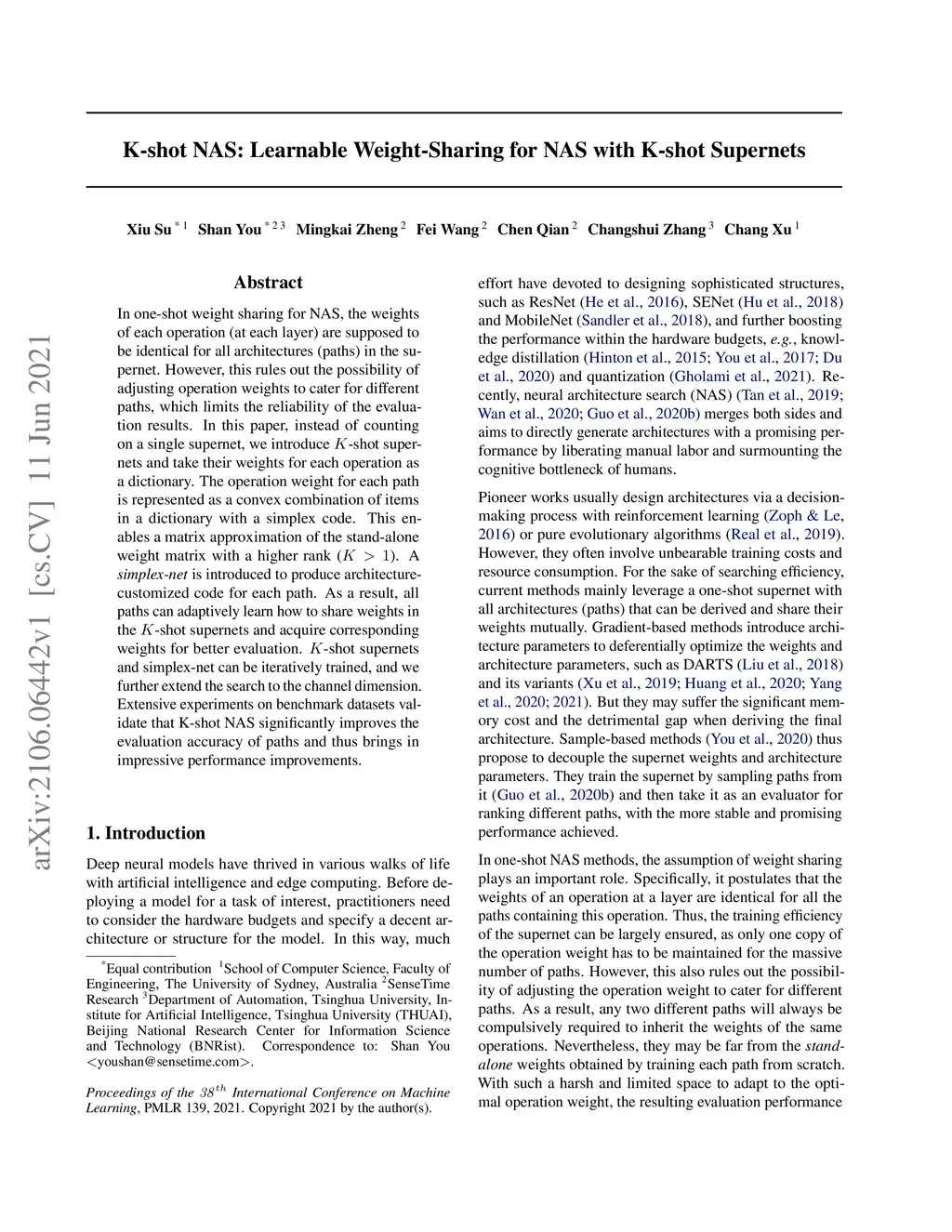 In one-shot weight sharing for NAS, the weights of each operation (at each layer) are supposed to be identical for all architectures (paths) in the supernet. However, this rules out the possibility of adjusting operation weights to cater for different paths, which limits the reliability of the evaluation results. In this paper, instead of counting on a single supernet, we introduce -shot supernets and take their weights for each operation as a dictionary. The operation weight for each path is represented as a convex combination of items in a dictionary with a simplex code. This enables a matrix approximation of the stand-alone weight matrix with a higher rank (). A \textit{simplex-net} is introduced to produce architecture-customized code for each path. As a result, all paths can adaptively learn how to share weights in the -shot supernets and acquire corresponding weights for better evaluation. -shot supernets and simplex-net can be iteratively trained, and we further extend the search to the channel dimension. Extensive experiments on benchmark datasets validate that K-shot NAS significantly improves the evaluation accuracy of paths and thus brings in impressive performance improvements.