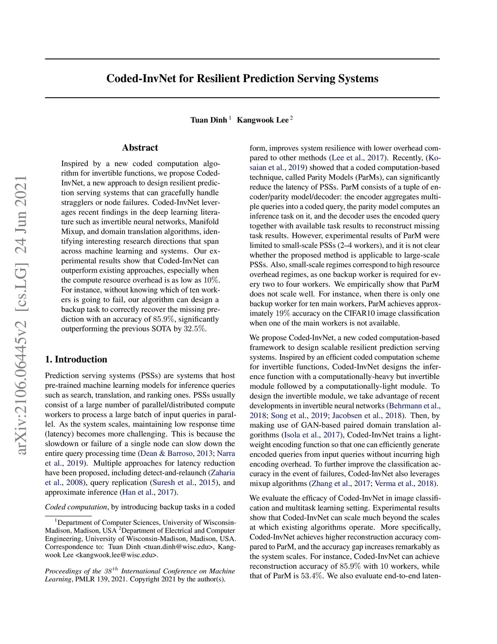 Inspired by a new coded computation algorithm for invertible functions, we propose Coded-InvNet a new approach to design resilient prediction serving systems that can gracefully handle stragglers or node failures. Coded-InvNet leverages recent findings in the deep learning literature such as invertible neural networks, Manifold Mixup, and domain translation algorithms, identifying interesting research directions that span across machine learning and systems. Our experimental results show that Coded-InvNet can outperform existing approaches, especially when the compute resource overhead is as low as 10%. For instance, without knowing which of the ten workers is going to fail, our algorithm can design a backup task so that it can correctly recover the missing prediction result with an accuracy of 85.9%, significantly outperforming the previous SOTA by 32.5%.